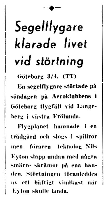 Segelflygare störtade på Västra Frölundas flygfält   [ sid 12 ]Teknolog Nils Eyton störtade på söndagen på Aeroklubbens flygfält vid Langeberg i Västra Frölunda pga ett häftigt vindkast. Han klarade sig med skråmor, men planet slogs i spillror. |