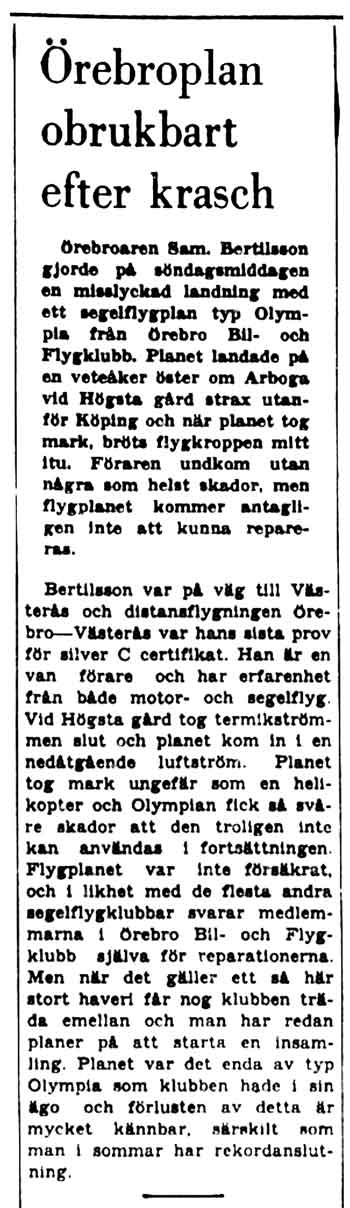 Aarre Samuel "Sam" Bertilsson, 1924-2011, föddes i Helsingfors men växte upp i Åbo. Han kom till Örebro under kriget och började genast glidflyga på Gustavsvik. Motorcert tog han 1948, men flygjournalerna anger att han flög ett par privata turer med Aero-Frabhs Klemm SE-BHE redan i oktober 1947. Han var medlem i ÖBFK motorflygsektion från 1948. År 1954 bytte han till segelflygsektionen och då under förnamnet Sam som ändå alla använde. Under 1950-talet tävlade han i segelflyg, men blev sedan mest känd som garvad bogserförare och motorflygare. Som bil- och lastbilsmekaniker drog han sig inte för att gräva i flygmotorer när så behövdes. Han nämns i: Intervju med en 82-årig Sam Bertilsson • NA: Sam kraschar Olympian • Att åka Pontiac cabriolet, 1938 års modell • NA: Klemm totalhavererar efter bogsering • Segelflyg, bogsering och autogiror • Motorflyg på Gustavsvik under 50-talet • NA: Brandbevakning från torn och flygplan • NA: Irve Silesmo ligger 2:a i segelflygs-SM • NA: Moth-Johansson till rekordhöjd • Historien om Terriern • En hårresande flygbogsering • Örebro segelflygklubbs utveckling |