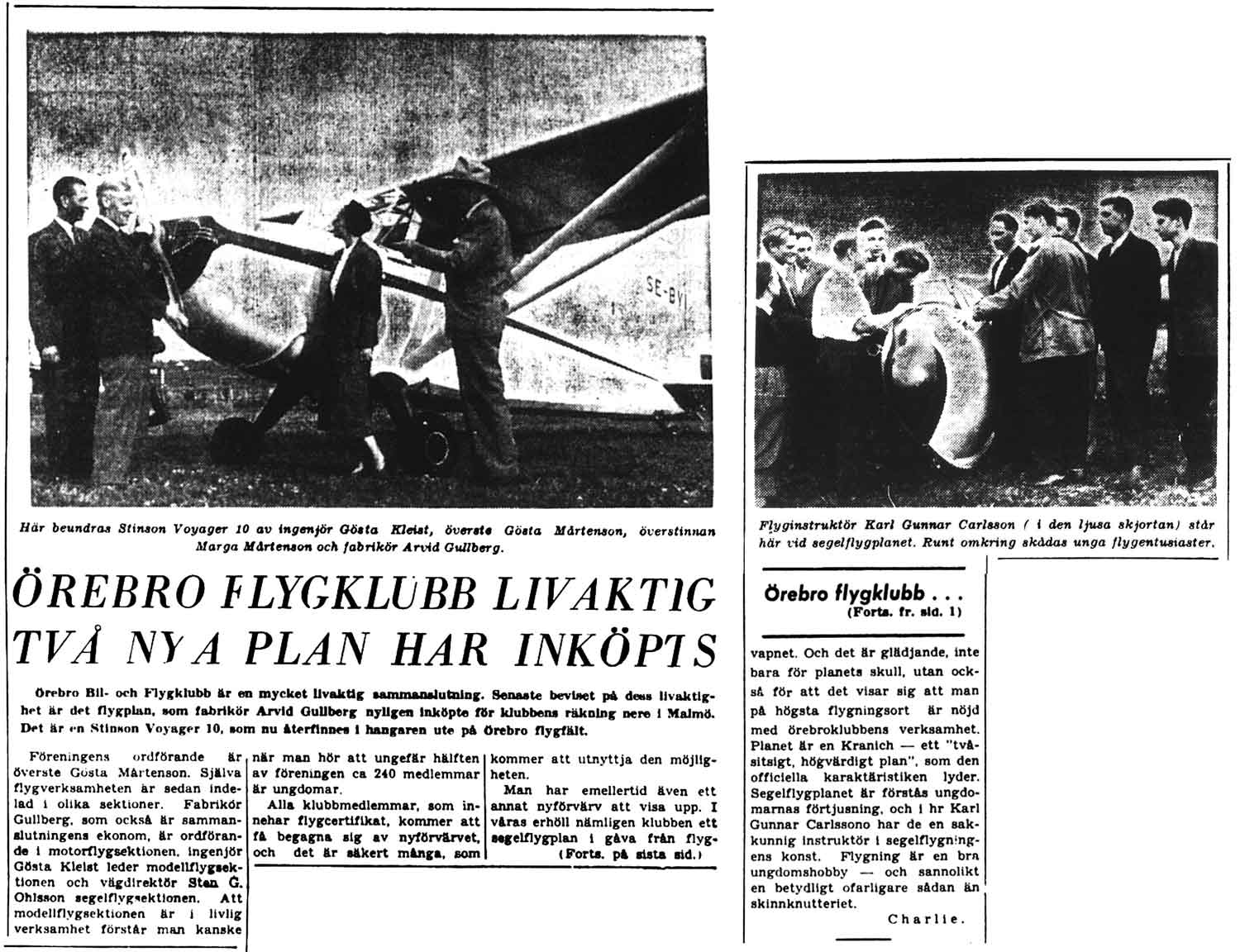 Karl-Gunnar kallades Kalle, Brödkalle eller Kalle bröd. Smeknamnet kom sig av att han ett tag körde ut bröd från APK-bageriet. Efternamnet har stavats både med K och C, men C blev vanligare med tiden. Kalle var medlem i ÖBFK:s motorflygsektion, var segelflygsinstruktör och byggledare när klubben byggde glidflygplan, allt detta redan 1947, kanske ännu tidigare. Han var en flitig segelflyglärare under hela 1950-talet och senare motorflygchef med stor förkärlek för Cessna. Han lämnade oss 2006. Han nämns i: Vad flygtrafikjournalerna 1947 berättar • Segelflyg, bogsering och autogiror • Molnflygning med Grunau Baby IIb • Att åka Pontiac cabriolet, 1938 års modell • NA: Synnöve och Dag Beskow lär sig segelflyga, sid 1 | sid 10 övre | sid 10 nedre • NA: Cessnan SE-EAC levereras • När Mothen SE-COL blev vrak i Örebro, del 2 • Minnesord efter Karl Gunnar Carlsson |