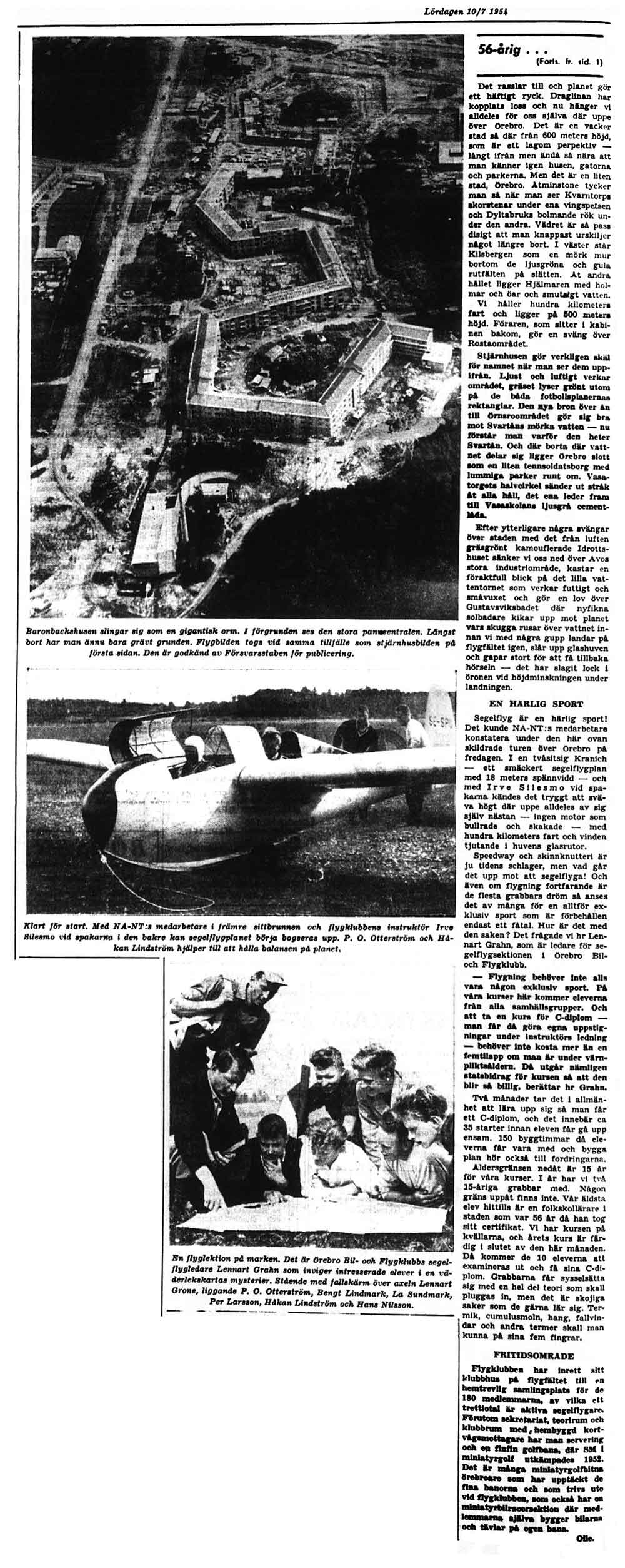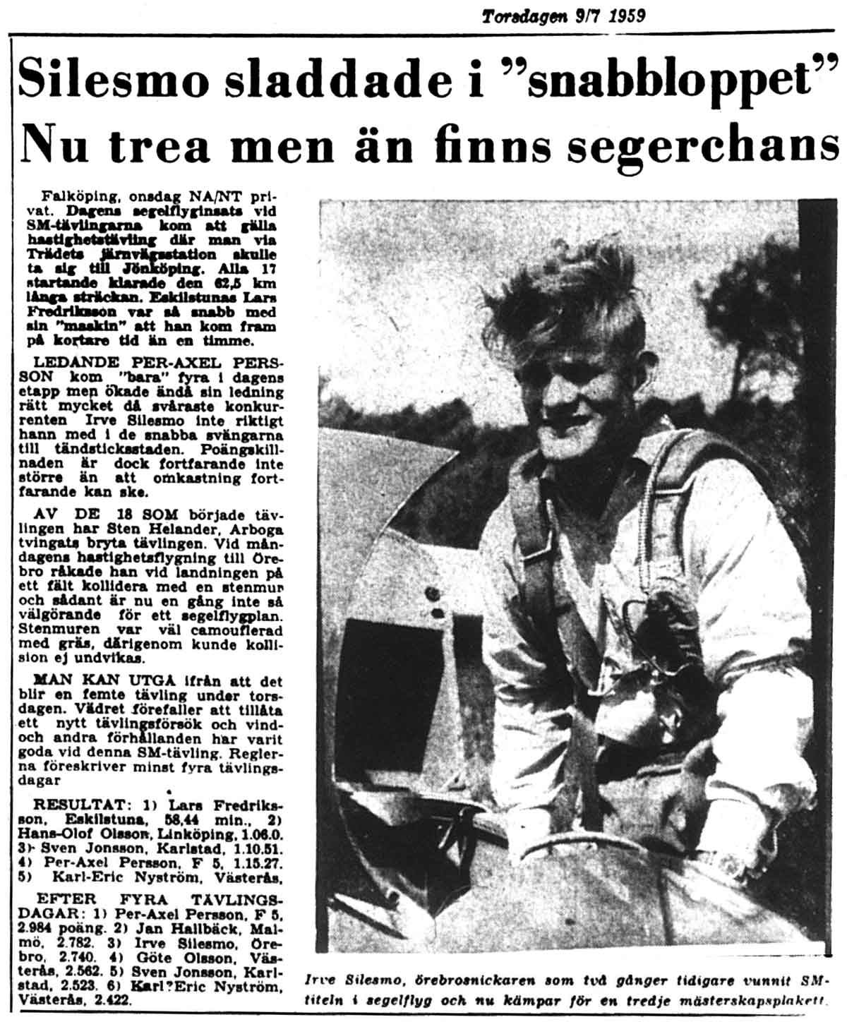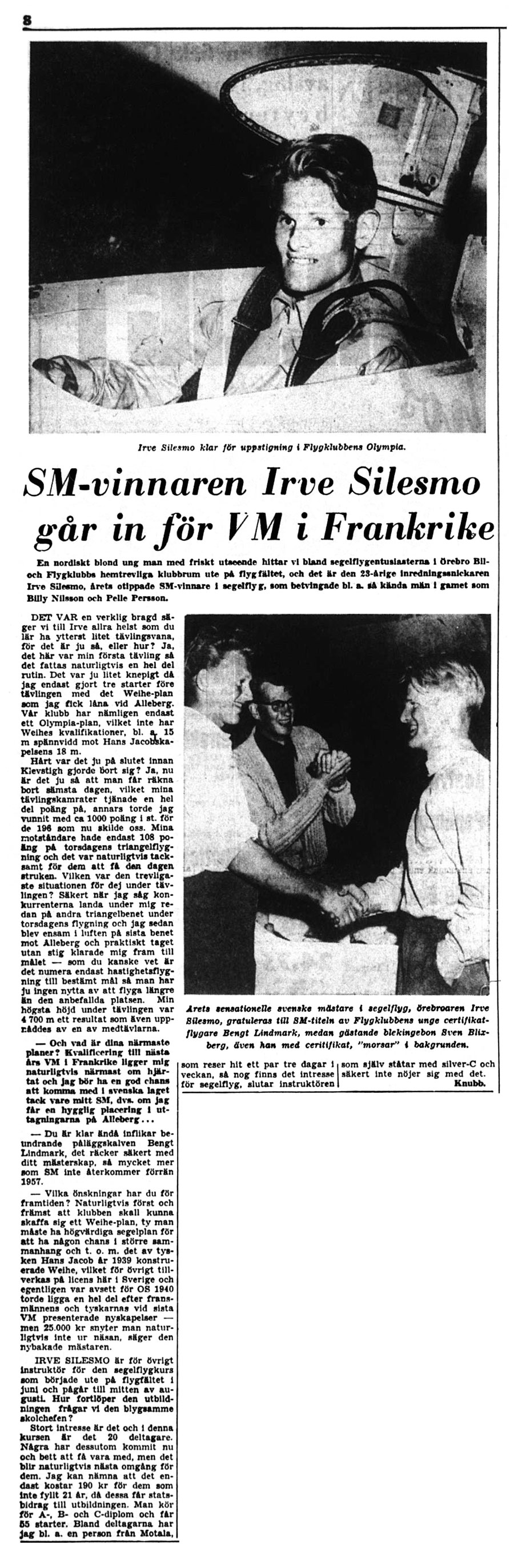 Irve Silesmo, född 1931, började skola för A-diplom i en SG 38 år 1948 och har därefter segelflugit på Gustavsvik varje säsong under fältets livstid. Tänker han besegra Täbyfältet på samma sätt? Irve har varit segelflyglärare och framför allt byggledare med ett fantastiskt handlag för både trä- och plastarbeten. Mest känd är han dock som tävlingsflygare med fem SM-titlar mellan 1955 och 1981 och som svensk representant i ett antal VM-tävlingar.