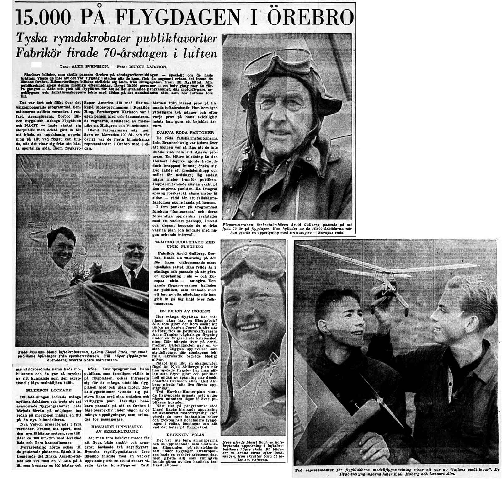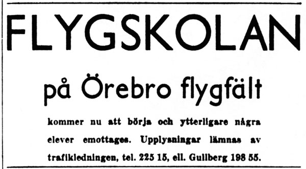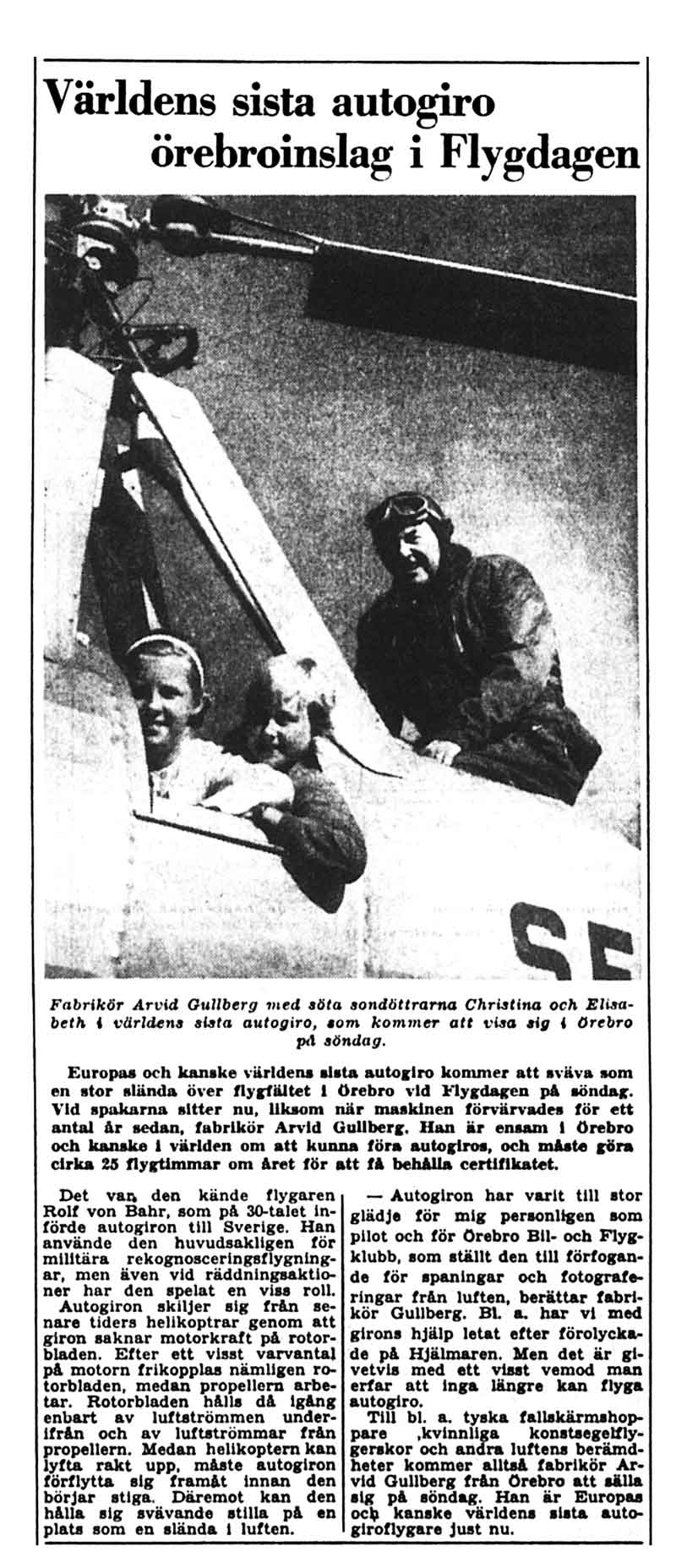 Arvid Gustav Gullberg, 1888-1961, var född i Mariestad, men etablerade firma Arvid Gullbergs Livsmedel i Örebro 1914 med charkuterifabrik i stadens centrum och 5 butiker i närområdet. Fabrikör Gullberg ingick i ÖBFK styrelse alla år vi har protokoll från, fram till sin död. Vårt äldsta protokoll är f.n. från 1936. Flygtrafikjournalerna för 1947 visar att han flög en del Cub och att han också flög in sig på Aero-Frabhs Hornet Moth SE-AGE. Han gick Rolf von Barhs autogiroskola 1949 och flög sedan autogiro ända till 1960, då hans och Sveriges sista Cierva, SE-AZB, såldes tillbaka till Rolf von Bahr. Mer ... Han nämns i: Vad flygtrafikjournalerna 1947 berättar • När jag var mek-praktikant på Gustavsvik • Segelflyg, bogsering och autogiror • Intervju med en 82-årig Sam Bertilsson • NA: Klubben får en Stinson SE-BYI och ett segelplan • ÖK: Flygklubbens årsmöte • ÖK: 20-årig Örebro-autogiro • NA: Annons för flygskola • NA: Gullbergs autogiro på flygdagen 31 augusti • NA: 15 000 såg flygdagen, sid 10 • Arne Tenglers diabilder • NA: Arvid Gullberg är landets äldste aktive flygare • NA: Gullberg säljer sin autogiro, sid 1 | sid 7 • von Bahrs minnesord efter Arvid Gullberg Externt material: bok "Vem är vem inom handel och industri?", 1944-45 |