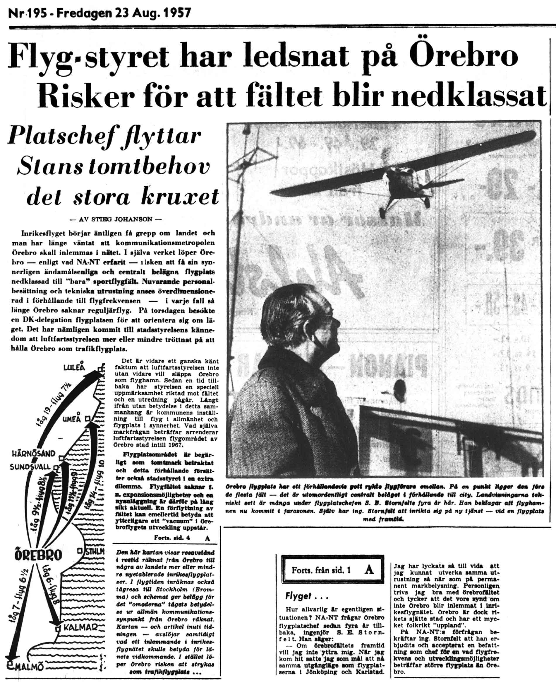 Stig Edward "Storken" Stornfelt, 1912-1984, var föreståndare och chef för Gustavsviksfältet och dess flygledning 1953-1957. Han hade flygförarutbildning och under sin tid i Örebro var han medlem i klubbens motorflygsektion.