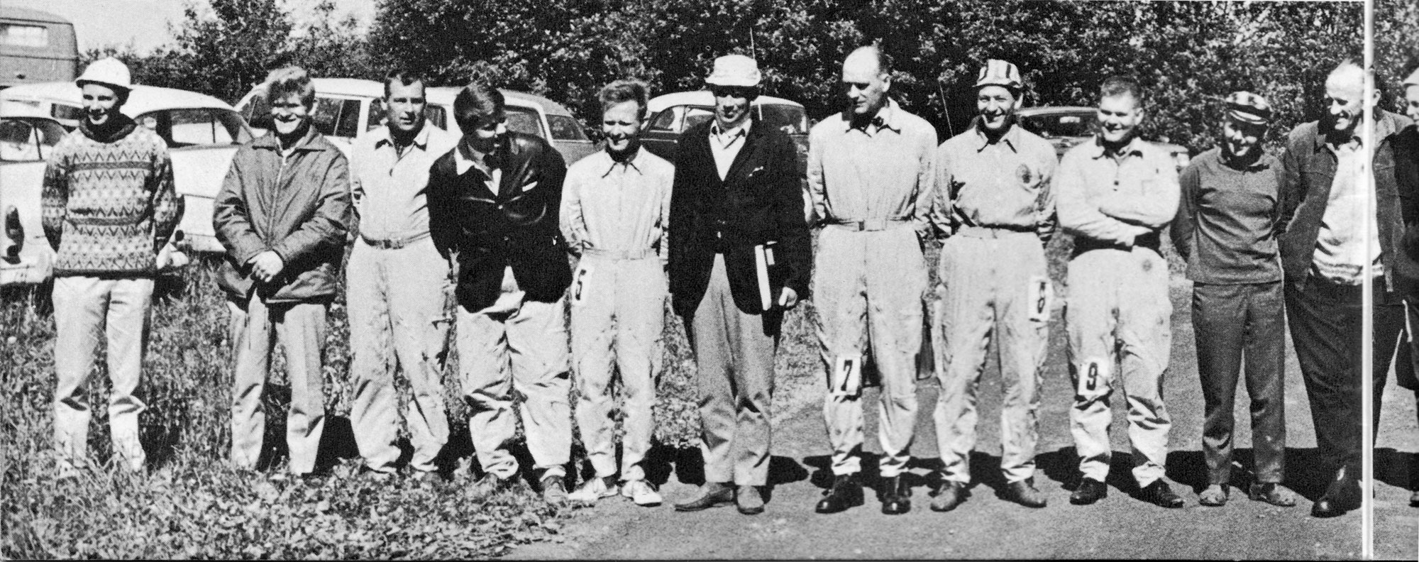 Vänstra halvan av bilden med alla tävlande vid SM 1967. Irve Silesmo står näst längst t.v. |