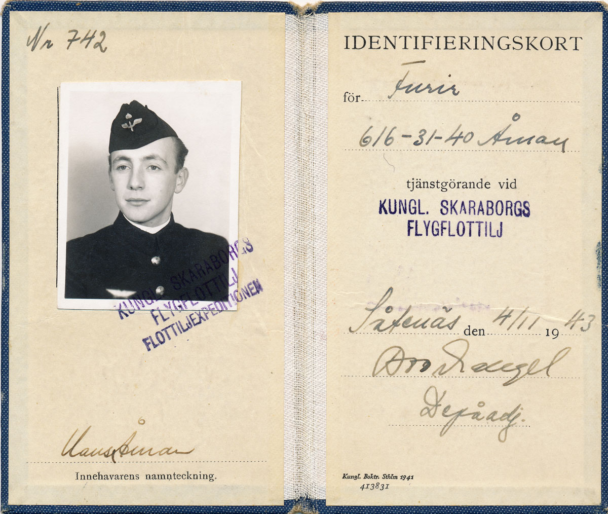 KrigetJag har varit "Flygsoldat 847 Åman" innan jag började flyga själv. Flygsoldater kallades ibland "hangarsopare". Det var meniga värnpliktiga som tvättade och skötte om plan. Varje plan sköttes av en korpral eller furir med mekutbildning och två meniga lärlingar. Värnpliktstiden i Flygvapnet var 7 månader (200 dagar), medan den i övriga vapenslag var 6 månader. Jag gick Flygreservskola 1942. Som värnpliktig flygförare (silvervinge nr R313) fick man skriva kontrakt på 9 månader grundflygutbildning plus 12 månader flygslagsutbildning, alltså 21 månader i sträck. Efter den grundläggande flygutbildningen placerades jag på F7 och Arne Tengler hamnade nog på F3. Sedan ryckte man in i beredskapen i omgångar under kriget. Man kunde vara hemförlovad på obestämd tid, men efter en vecka eller två kallade de plötsligt in en igen. Det blev väldigt hackigt. År 1944 flög jag målgång i Luleå. Målgång är när luftvärnet siktar direkt på planet utan att skjuta. Då får man flyga roligt, försöka göra det svårt för luftvärnet och överraska dem. Vid krigsslutet upphörde nog beredskapen för de flesta. Några kunde få jobb på Kartverket, men de flög bara på somrarna. Arne kunde säkret jobba som dräng på sin fars gård. Han började också arbeta som körskollärare i Borås, förmodligen bara en kort period. |