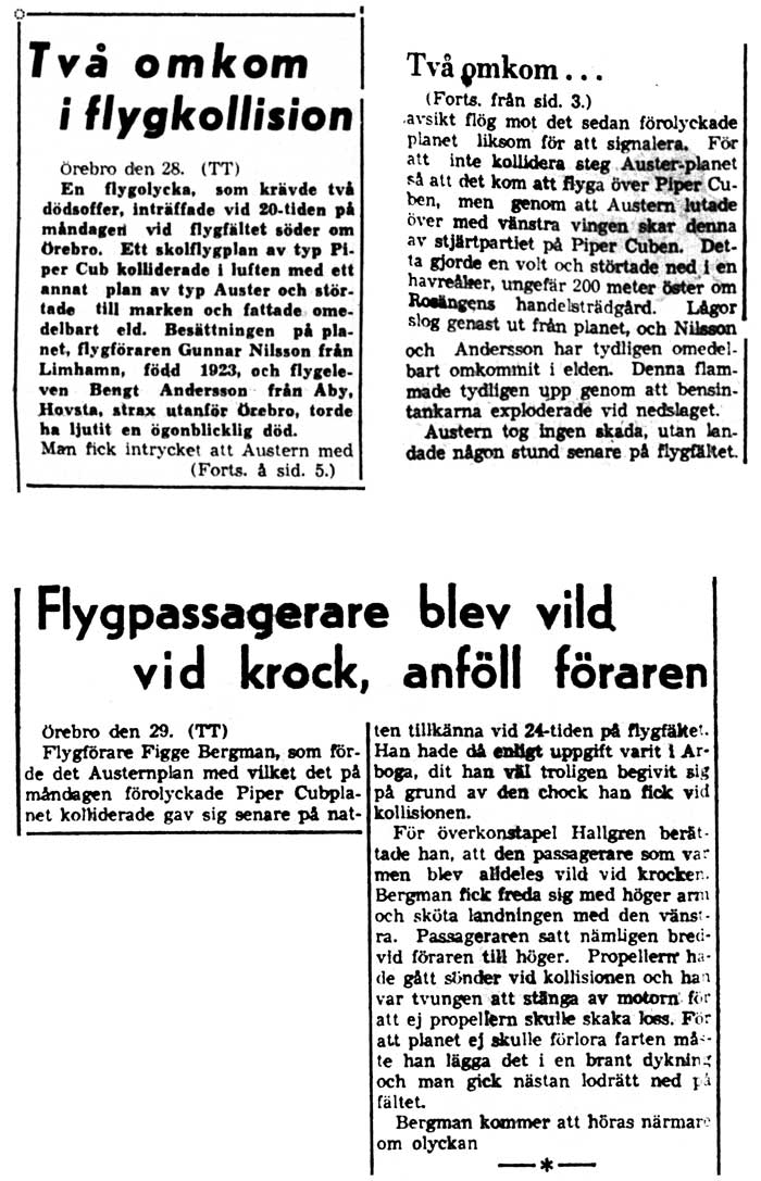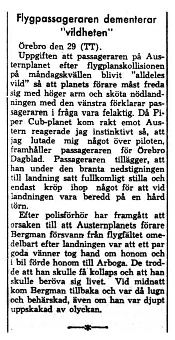 Flygkollisionen över ÖrebroDen ödesdigra kollisionen mellan Aero-Frabhs Auster SE-ARE och flygklubbens Cub SE-ATN strax utanför Gustavsviks flygfält den 28 juli gav eko även i Norrbottens-Kuriren. Själva olyckan beskrevs i en artikel. Austerpiloten Figge Bergman berättade i en annan bl.a. att passageraren i Austern blev vild vid krocken så att Figge var tvungen att freda sig med ena armen och sköta nödlandningen med den andra (29/7). Men den uppgiften dementerade sedan passageraren, eller ansåg den åtminstone vara starkt överdriven (31/7). I Örebro Dagblad (ÖD 1/8) skulle snart även Figge Bergman dementera detta och säga att uppgiften är fullständigt gripen ur luften. |