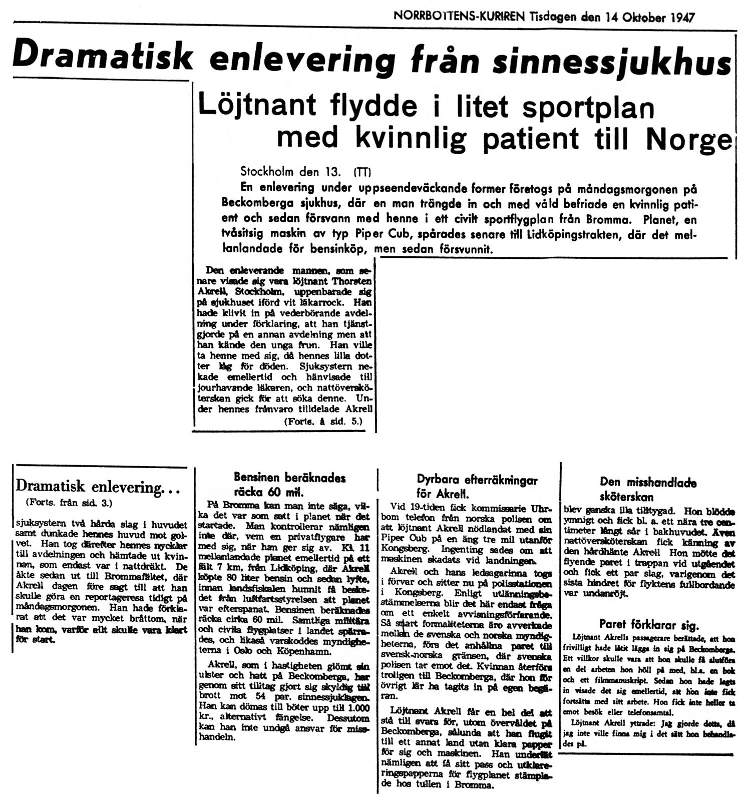 Enlevering med Cub i Norrbottens-Kuriren 1947Detta är en del av min sammanfattning av vad Norrbottens-Kuriren förtäljer om flyget i Norrbotten 1947. Övriga delar nås från denna artikels huvudsida. Måndag morgon den 13 oktober utspelades ett drama, visserligen i södra Sverige, men som jag ändå måste berätta om. Det behandlas i artiklar 14/10, 15/10, 16/10, 21/10. Löjtnant Thorsten Akrell gick in på Beckomberga mentalsjukhus utklädd i vit läkarrock. Där använde han våld mot personalen för att kunna befria och fly med en kvinnlig patient. De tog sig till Bromma och flög därifrån i en Piper Cub. Efter en mellanlandning i Lidköpingstrakten för att tanka, fortsatte de till Norge. De nödlandade på en äng i närheten av Kongsberg där de greps av norsk polis. Kvinnan, fru "Lolo" Forsell, hade frivilligt låtit lägga in sig på Beckomberga för att behandla sitt narkotikamissbruk. Ett villkor var att hon under behandlingen skulle få slutföra en del arbeten som hon höll på med, bl.a. en bok och ett filmmanus. Sedan hon hade lagts in visade det sig emellertid att hon inte fick fortsätta med sitt arbete. Hon fick inte heller ta emot besök eller telefon. Löjtnant Akrell, som visade sig vara hennes fästman, sa att han enleverade henne för att han inte fann sig i det sätt hon behandlades på. Den norska polisen släppte fru Forsell, gav henne två månaders uppehållstillstånd och meddelade att hon hade blivit utskriven från Beckomberga. Hon var alltså helt fri, men ville stanna i Kongsberg tills det blev klart vad som ska hända med löjtnant Akrell. Han riskerade utlämning och flera års straffarbete, främst för misshandeln av personal vid fritagningen. |