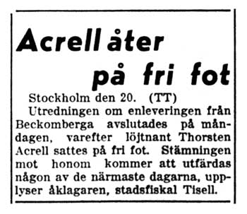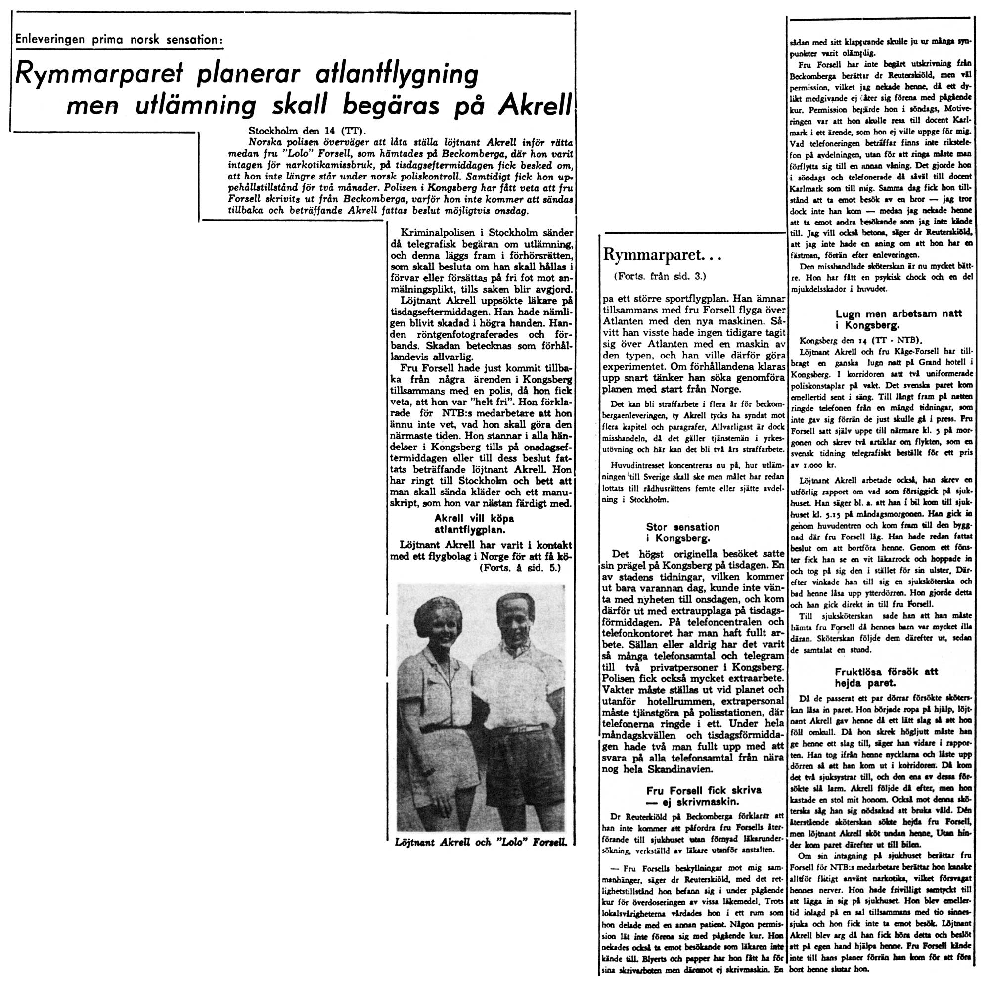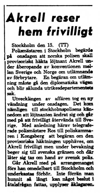 Akrell ville helst köpa ett större sportflygplan i Norge och flyga över Atlanten tillsammans med fru Forsell. Troligen har ingen förut gjort en sådan resa med den flygplanstypen, och han ville därför göra experimentet så snart förhållandena klarats upp. En av Kongsbergs tidningar kom ut med ett extranummer bara för att berätta om denna märkliga historia. Polisen i Kongsberg fick avdela två man till att bara svara på frågor från folk som ringde från nära nog hela Skandinavien. Fru Forsells läkare sa att hon visst hade fått skriva – med blyertspenna men inte med skrivmaskin, eftersom det skulle störa den patient hon delade rum med. Ringa kunde hon inte för att det inte finns någon rikstelefon på avdelningen. Vid ett tillfälle hade hon dock fått ringa från en telefon på en annan våning. Besök av okända personer nekas alltid, och läkaren hade ingen aning om att Akrell var hennes fästman. Fru Forsell uppgav själv att hon blivit inlagd på en sal tillsammans med inte en utan tio sinnessjuka patienter. Hon hade inte haft någon aning om Akrells planer förrän han kom dit för att föra bort henne. På onsdagen bestämde sig löjtnant Akrell att frivilligt återvända till Sverige och låta sig omhändertas av svensk polis. På måndagen en vecka efter enleveringen sattes Akrell på fri fot. Stämningen mot honom skulle utfärdas någon av de närmast följande dagarna. I civilregistret står T Akrell i Stockholm som ägare till Cuben SE-AUX, döpt till "Skywitch", från augusti 1946 till februari 1948. I Gustavsviks flygtrafikjournaler 1947 anges han besöka Örebro den 13 juli 1947 i just SE-AUX. Det var tre månader före enleveringen. |