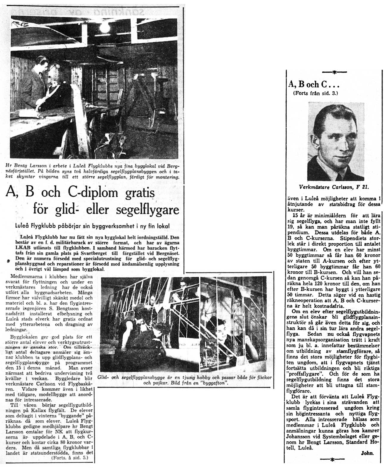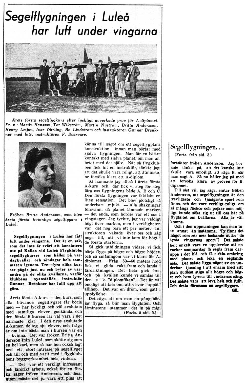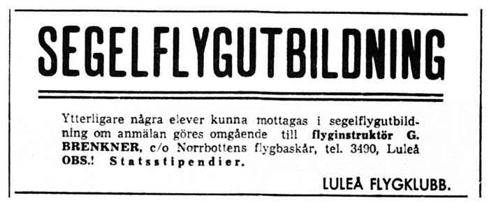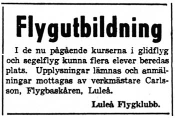 Till våren börjar glid- och segelflygutbildningen på Kallax flygfält. Verkmästare Carlsson tar emot anmälningar (20/6 sid 2). Klubben får använda fältet när F 21:s ordinarie tjänst är slut för dagen. Glidflygplanet dras upp med klubbens ombyggda Ford. Flygklubben har också en Grunau Baby som man får flyga när man tagit B-diplom. Ibland ses även flygbaskårens Moth stiga till väders med en Kranich i släptåg (20/6 sid 3, 5). Under sommaren disponerar flygklubben en heltidsanställd instruktör, Gunnar Brenkner, som tänker göra Luleå till en segelflygande stad innan han reser härifrån igen i mitten på augusti (20/6 sid 3, 5). Han har c/o-adress och telefon Flygbaskåren (7/7). |