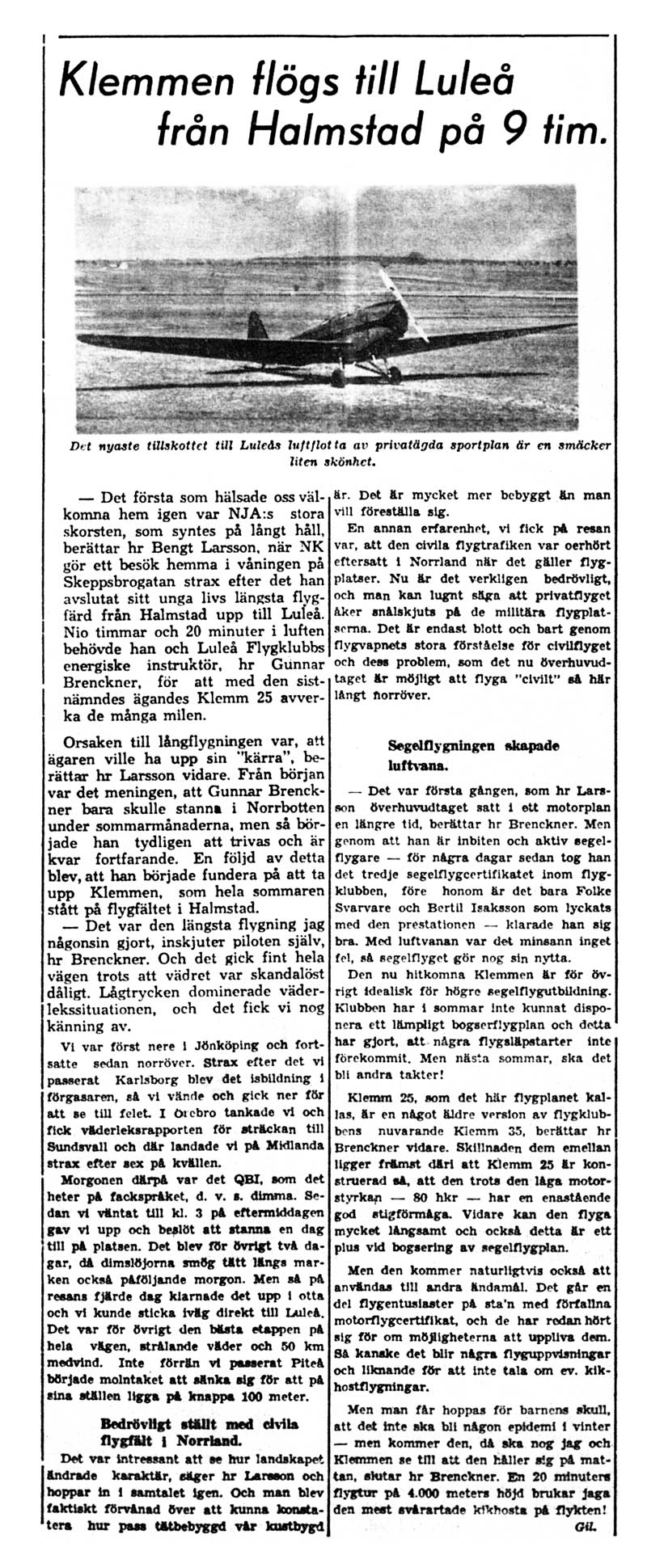 Fröken Britta Andersson blev årets första kvinnliga segelflygare i Luleå (9/7). Instruktören Gunnar Brenkner trivdes så bra i Norrbotten att han blev kvar efter segelflygkurserna. Till slut flög han upp sin Klemm 25 från Halmstad tillsammans med Bengt Larsson, segelflygare i luleåklubben. Rutten var Halmstad – Jönköping – Karlsborg – Örebro – Sundsvall/Midlanda – Luleå (26/9). Gustavsviks flygtrafikjournaler 1947 anger mycket riktigt att Brenkner mellanlandade i Örebro en timme den 20 sep med Klemm 25 SE-ANC på väg från Karlsborg mot Härnösand. Bengt konstaterade efter turen att den civila flygtrafiken är oerhört eftersatt i Norrland när det gäller flygfält. Privatflyget tvingas åka snålskjuts på de militära flygplatserna, och man får vara tacksam för flygvapnets stora förståelse för civilflygets problem. Denna sommar har det inte funnits något lämpligt bogserflygplan tillgängligt för klubben, men nästa sommar kan man använda denna Klemm 25 (26/9). Klubben hade visserligen redan en Klemm 35, men kanske behövs en mera långsamflygande bogserare för det aktuella segelplanet. |