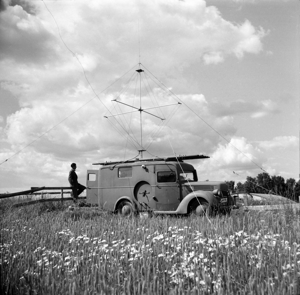 Ny antenn 1963I bilden från 1963 ovan noterade vi en diffus förlängning på trästolpen närmast Tornet, alltså den stolpen som inte kröntes av någon VHF-antenn. På följande bild från 1963 eller 1964 syns förlängningen en aning tydligare. |