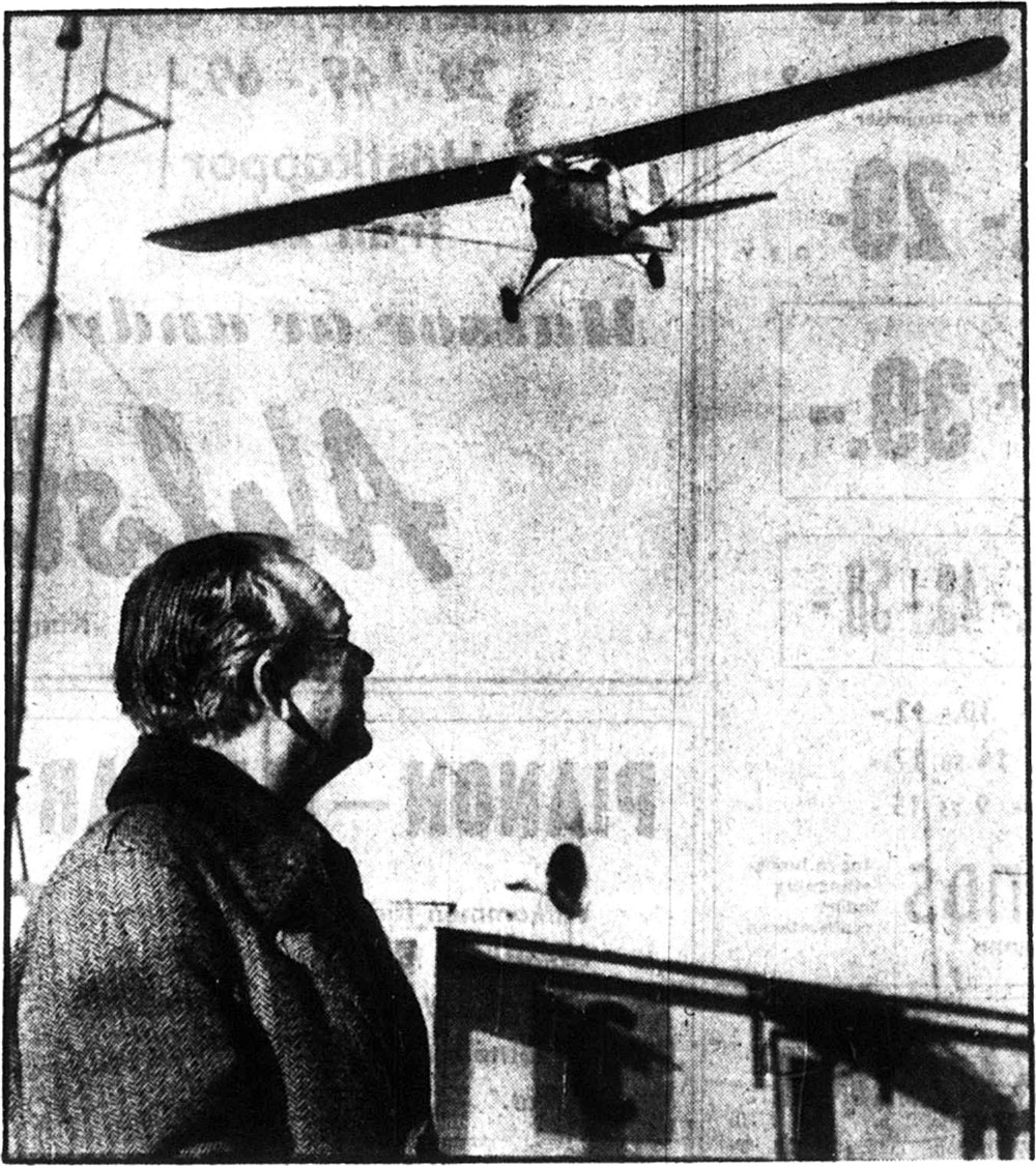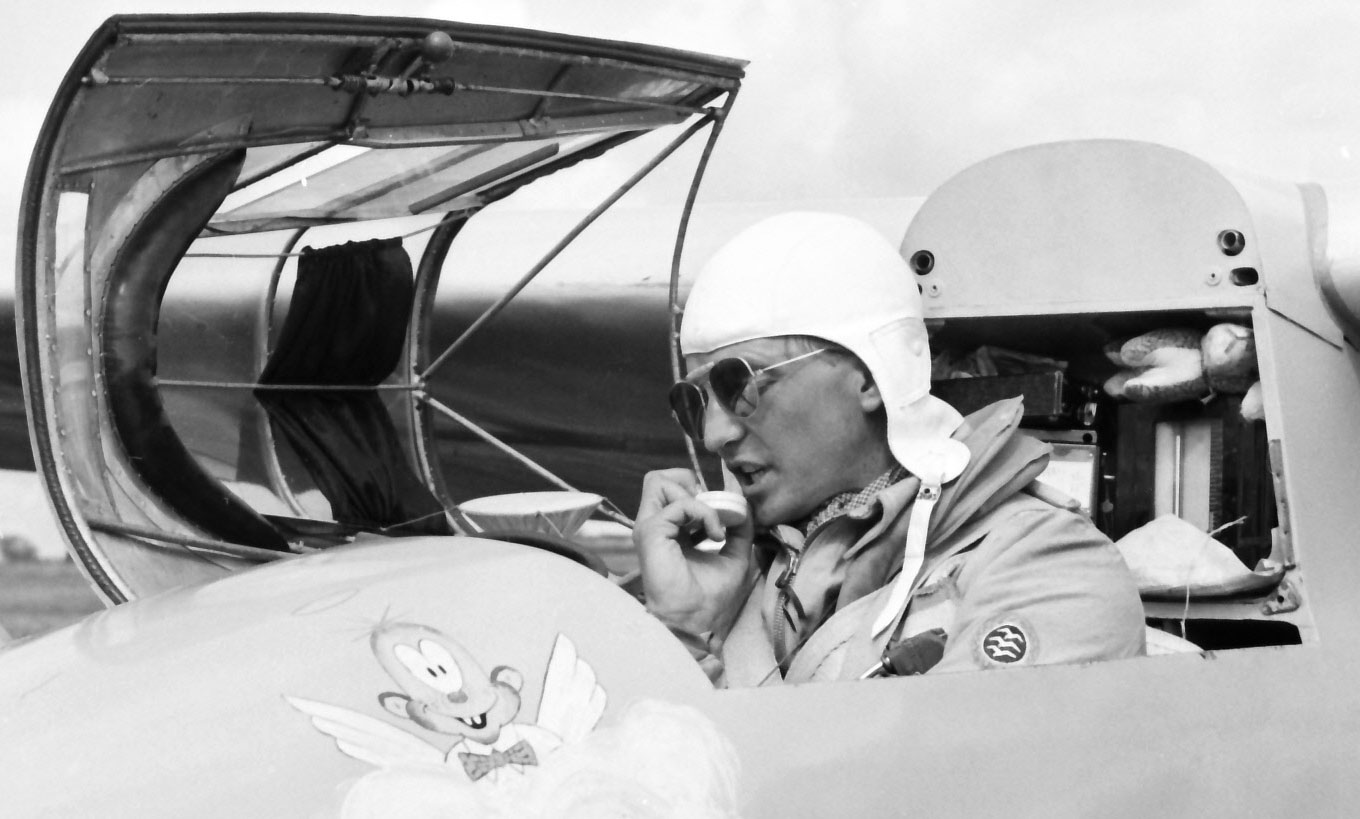 Vi ser en mikrofon i Billy Nilssons hand, en provisoriskt monterad högtalare på huvens insida och en radio bakom huvudet intill barografen med maskoten ovanpå. Tage Löf och Billy hade VHF-radio för samband med sina följebilar, och det hade även Paul Mac Cready och P G Mallett. Vi vet att denna trafik följdes från Örebrofältet (*Radio i segelplan på VM). Kanske användes då den förmodade VHF-antennen vid Tornet. |