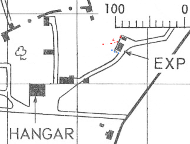 I denna tredje vinkel ser man att tre av stolparna verkar stå i linje med varandra. En stolpe är mörkare än de andra, och det är den på alla bilderna. VHF-kablarna mellan stolparna syns tydligt på denna bild. Det finns en diffus förlängning på den högra stolpen som liknar en fjärde flaggstång. Det är en ny antenn som måste ha tillkommit detta år. Mer om den i följande avsnitt. Med lite mätning på de tre fotona ovan och inritande av mätresultaten på LFV flygfältsskiss från 1950-talet har jag försökt bestämma antennstolparnas placering. Jag mätte samtidigt lägena för de tre flaggstängerna framför Tornet. Här är resultatet: |