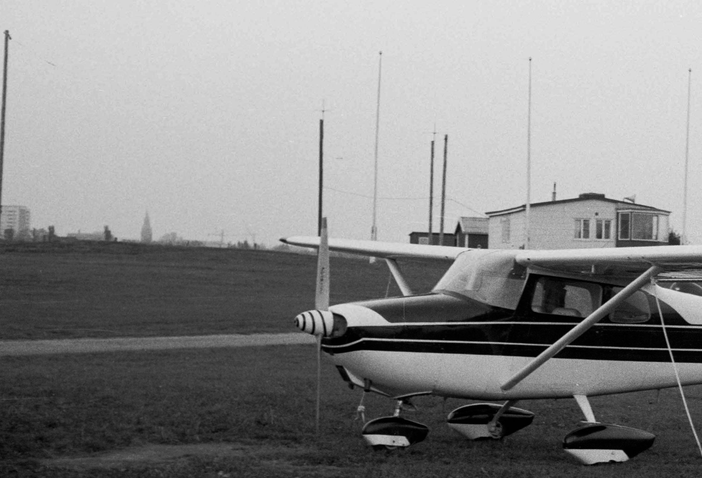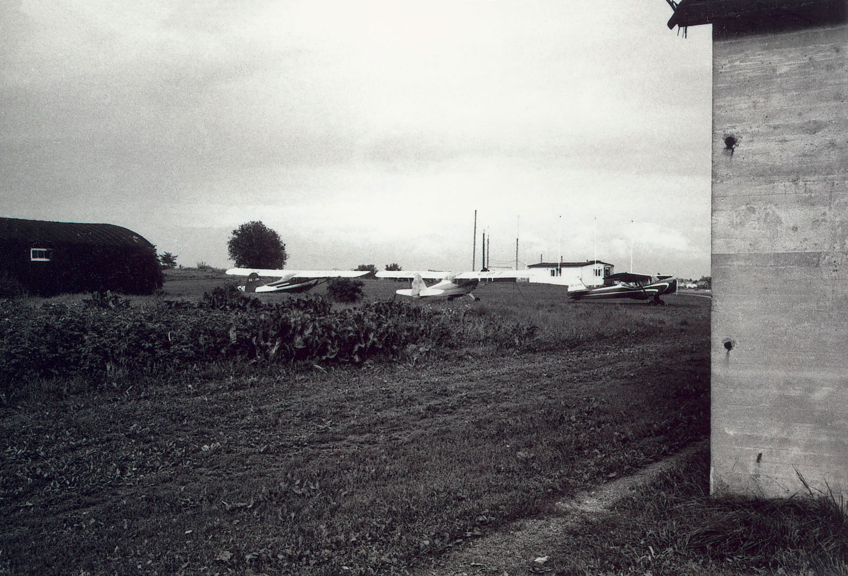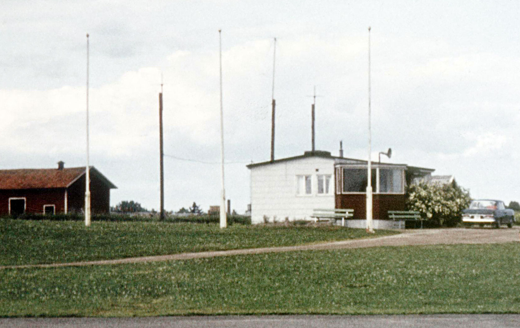 Nu står en jordplansantenn för VHF vid Tornets gavel. Vem har satt upp den? Har den samband med den gröna byssjan bredvid? Vid denna tid pågår polisens helikopterversamhet för fullt. Kan både byssjan och VHF-radion ha med det att göra? Å andra sidan har motorflygtrafiken nog ökat såpass på Gustavsvik att fältvakten, vid denna tid Arne Tengler, säkert behövde tillgång till VHF. Man ser också vädermätinstrumet på taket. Fältvakten fick antagligen rapportera väder till många annalkande plan via radion. Observera den gula flaggan med emblemet för Örebro stads 700-årsjubileum. Flaggan finns där därför att Örebro stad numera har ansvaret för flygfältet. |