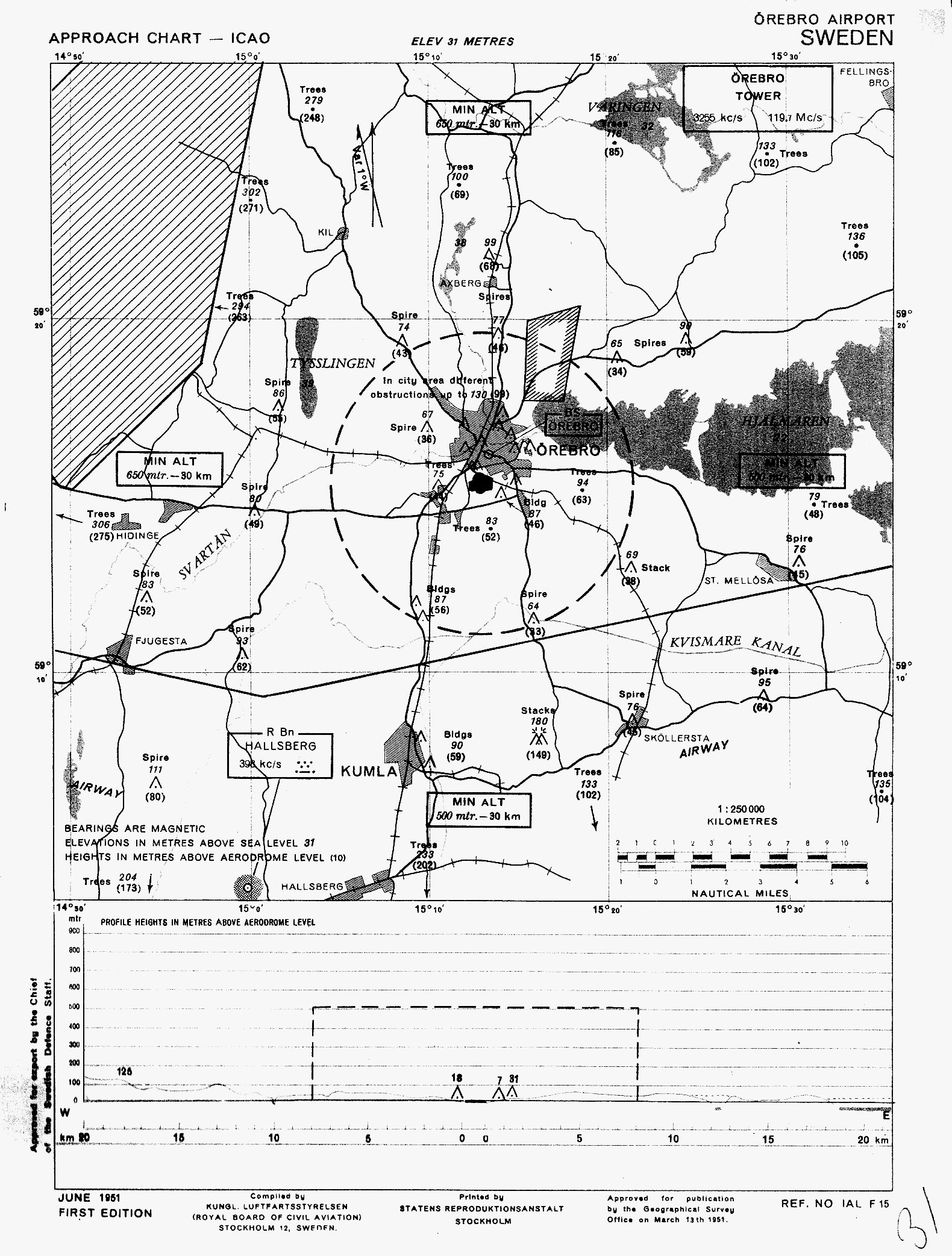 Hade Gustavsvik en radiofyr?Flera källor anger att Gustavsvik faktiskt hade en radiofyr under en kort period: – Den 8 oktober 1954 skrev Örebro-Kuriren (*ÖK 1954) att en radiofyr är på väg att sättas upp. – I augusti 1955 skrev KSAK-tidningen Looping nr 8 (*Looping 1955) att till nyheterna på Gustavsvik hör en inflygningsfyr i Almby. Kanske menar de att denna fyr då fortfarande var under uppförande. – Den 17 juli 1956 skrev Örebro-Kuriren (*ÖK 1956) att det vid Örebro flygfält finns en landningsfyr, närmare bestämt i Almby i fältets östra del. – Fältvakten Gunnar Edström berättade i flygklubbens tidning Vingspalten om fältets historia. Han skrev bl.a. att när tidningsflyget nedlades, drogs trafikledartjänsten in och radioutrustningen med fyra frekvenser samt en inflygningsfyr öster om fältet togs också bort. Alla dessa källor talar alltså om en radiofyr vid Gustavsvik. Men på LFV:s karta för 1 september 1955 som Bo Justusson publicerar på sin webbplats finns varken NDB-fyr eller pejl vid Örebro: |