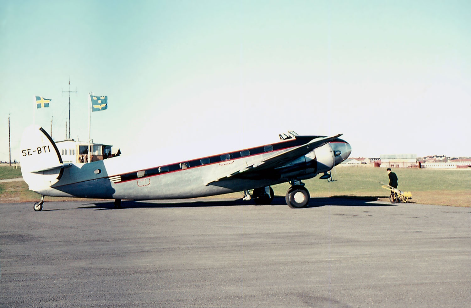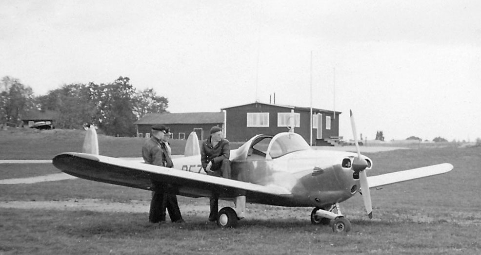 På denna bild syns inga radioantenner. Tornet såg nog likadant ut som vid ABA-trafiken 1946, men år 1947 fanns ingen linjetrafik på Gustavsvik. Enda behovet av trafikledning det året var förmodligen i samband med segelflygs-SM den 3-12 juli, men jag tvivlar på att Televerket körde hit någon radiobuss då. Även om flygrörelserna var många just under SM, var det nog få av dessa plan som hade kommunikationsradio. Det enda större plan som sticker ut i den omfattande flygtrafiken det året var Ahrenbergsflygs Junkers Ju 52 SE-AFA som med (Östen?) Lindberg alternativt (Mauritz?) Hamrin vid spakarna rundflög för glatta livet mellan 17 juni och 27 juli. Jag gissar att trafikledningen bara använde ljussignaler och muntliga överenskommelser med flygarna under SM. |