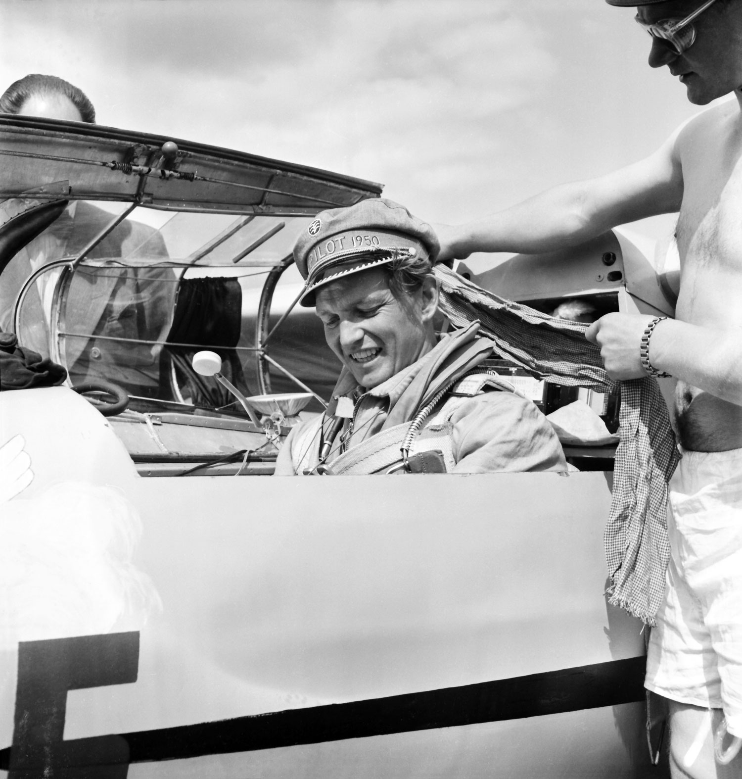 Tage Löf igen: När det gäller de av Olle Berg skapade radioutrustningarna för segelflyget, så kan jag nämna lite om deras användning även vid andra evenemang än VM 1950 i Sverige. Vid VM i Spanien 1952, då Billy och jag representerade vårt land, hade vi Olles förnämliga apparater i våra plan. Olle var själv med och ingick i mitt lag. Radion användes flitigt. Även i England 1954 fanns lika utrustning i kärrorna. Pelle Persson och jag hade stor nytta av dessa tillbehör. Olle B fanns med även vid detta VM, fast nu i Pelles team. |