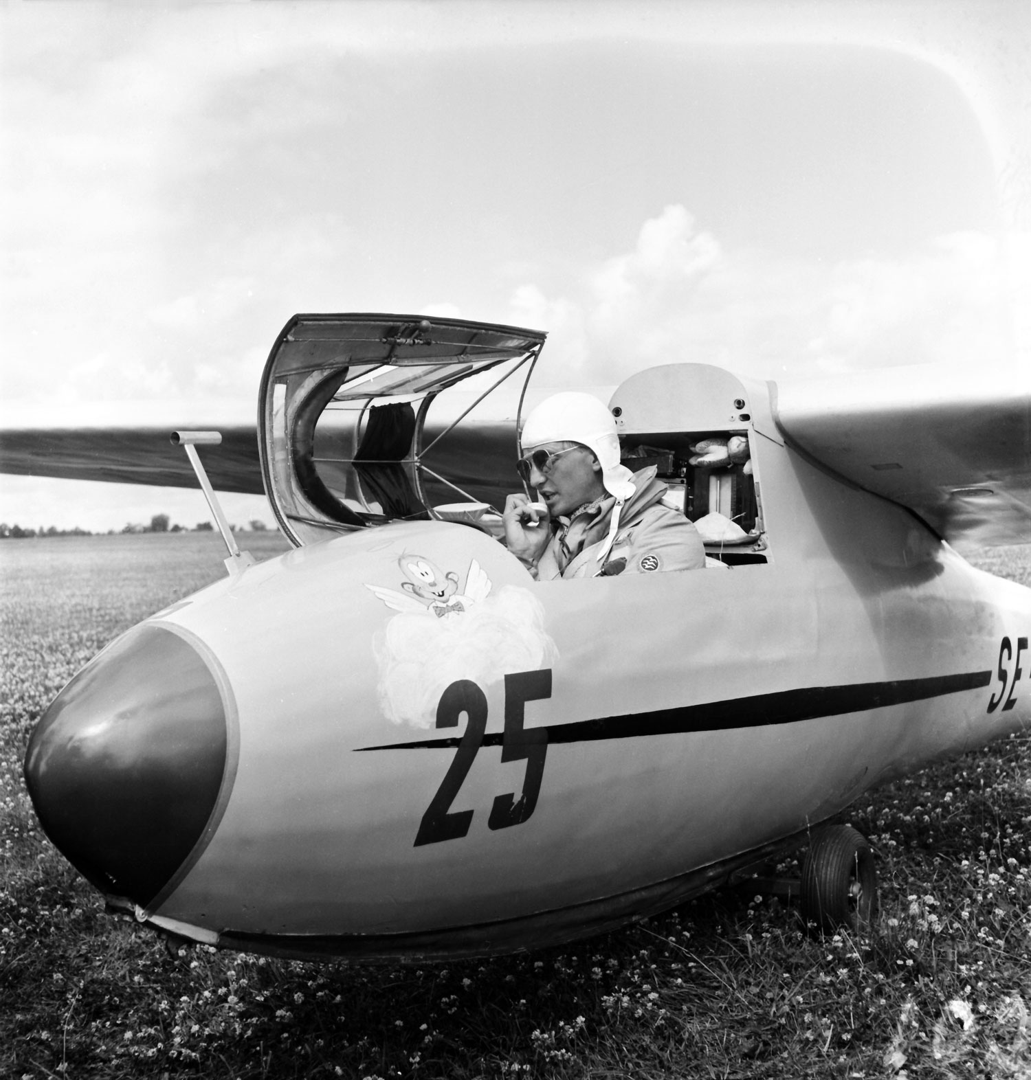 Alf Johansson (samlar information om Billy Nilsson): Det är Billy på bägge bilderna. Billy hade alltid med en maskot och den syns bakom honom. På omslaget till Teknikens Värd nr 16 1952 ser man Billy i en snarlik bild i färg där han håller maskoten i handen och där planets dekoration på sidan av nosen är densamma. I tidningen Cumulus från augusti 2007 finns Tage Löfs artikel "Om tre Weihe" på sid 5. Jag har med mild förvanskning sammanställt det som är mest intressant för oss just nu: Under några veckor före VM tränade Billy Nilsson och jag på Ålleberg i deras tre Weihe SE-SCL, SCM och SCN. Vi dömde båda ut SE-SCL som blivit skev efter ett antal reparationer. Billy fick SE-SCN och jag tog SE-SCM. Olle Berg utrustade våra två plan med radio. Det var första gången i Sverige som segelplan hade radio. Han satte också upp en radiostation i Ållebergs restaurang och körde hårt med oss i radioträningen. En dag flög Billy och jag t.o.r. Trollhättan. Då hade bara jag radio, och jag rapporterade till Olle var femte minut. När jag rapporterade ca 15 minuters flygning kvar till vändpunkten, ringde Olle B flygklubben i Trollhättan och bad om kontroll när jag kom till deras stad. Tage Löf (segelflygare, har flugit mer än 2400 timmar, blev 1949 den första civila SM-vinnaren): Det råder inget tvivel om att piloten är Billy himself på båda bilderna ovan. Den radioutrustning som Olle Berg satte in i Billys och min Weihe inför VM vägde 7 kg. Flygvapnets deltagare skulle också ha radio, men deras utrustning vägde 40 kg, så de avstod. Vi använde radion för att hålla kontakt med våra följebilar. Jag vet inte om det var kortvåg eller VHF, men räckvidden var lite begränsad. På VM:s sista dag var min bil i Hedemora när de hörde att jag rapporterade vid Orsa, men då kunde jag inte höra deras svar. Det var 12 mil mellan orterna. Jag hade anmält Orsa som mål. Att landa på angivet mål skulle ge extra poäng, men jag såg att det redan hade landat 12 tävlande där, så jag chansade på att nå såpass mycket längre så att jag skulle få mer poäng än målbonusen. Det lyckades. Jag tog mig över alla täta skogar och nådde ända till Svenstavik vid Storsjöns sydspets. Följebilen ringde tävlingsledningen i Örebro och fick då veta var jag landat. |