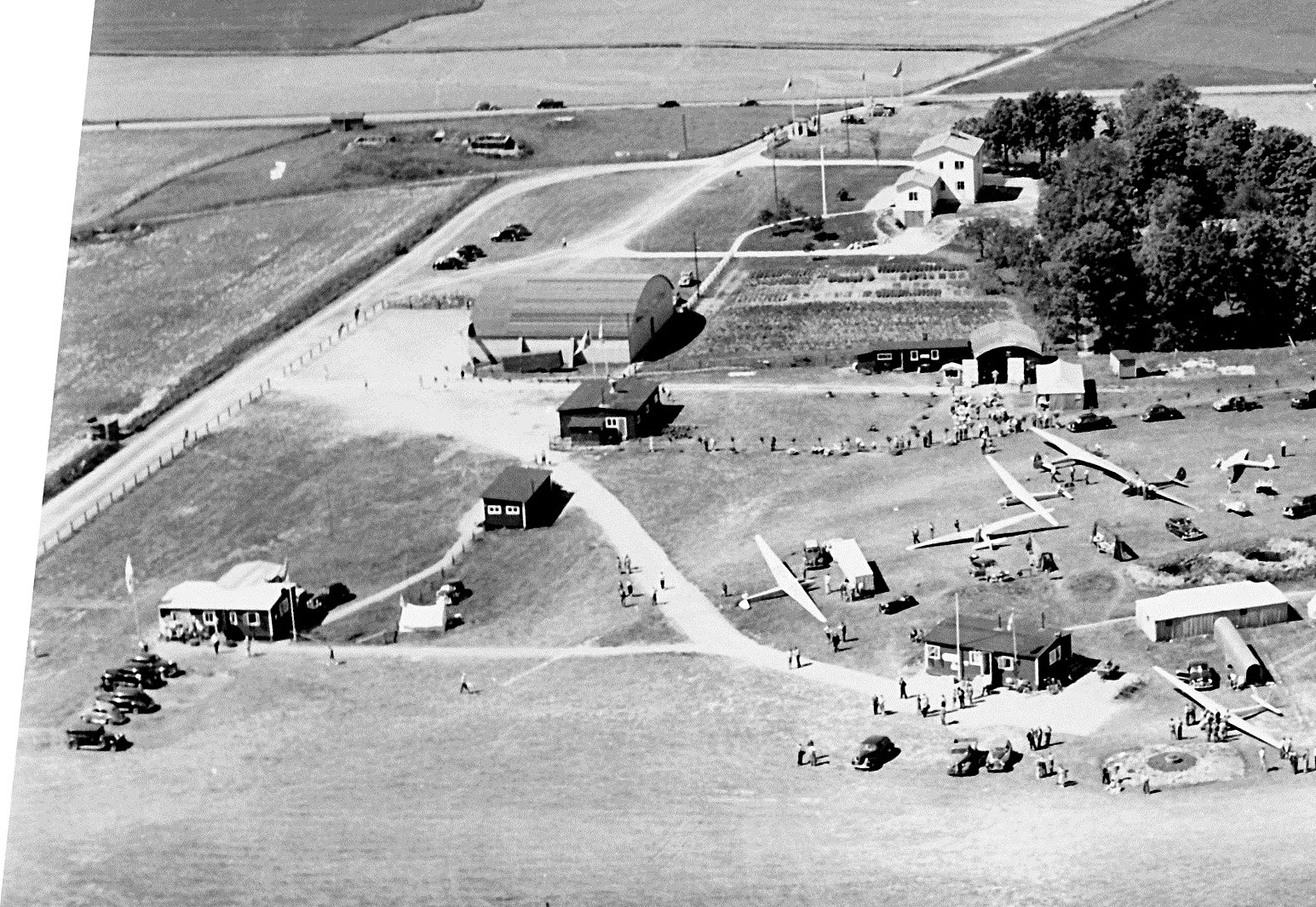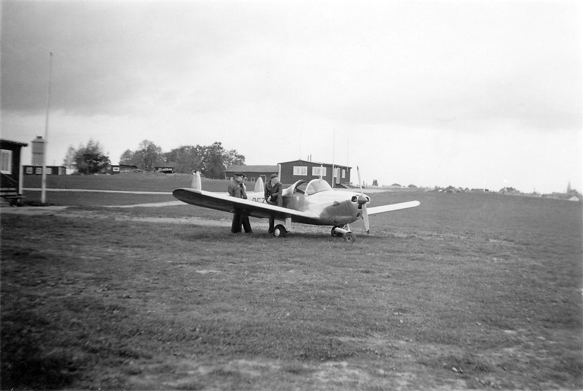 Att denna bild med Ercoupen SE-BFZ är från 1950 är inte givet. Här är mitt resonemang för att det ändå är så. Enligt SFF civilregister registrerade planet redan 1947, men först när Ragnar Eriksson i Arboga köpte det 1950-03-20 och fick det flygdugligt 1950-04-07 blev Örebrobesök naturligt. Ragnars son Ronnie minns en tur med sin pappa från Örebro till Arboga i detta plan sommaren 1950, så örebrobesök förekom helt klart. Dock säger Ronnie att Ragnar inte syns på bilden. SFF:s civilregister antyder att Örebro flygklubb var intresserad av att köpa planet, men det blev Gösta Kleist i Örebro flygklubb som köpte det privat 1950-10-23. Det flög sedan med Örebro som bas tills det havererade 1955-08-04. Eftersom den obeskurna bilden saknar den örnstaty som restes vid VM i segelflyg 5-16 juli, gissar jag att bilden är från 1950, men före VM. Mot detta kan anföras att det är när örebrobesök inte är naturligt som det blir särskilt intressant att ta en bild. Fast då kan ju fotot vara från Ragnar Erikssons första tur till Örebro i april 1950, eller första gången en försäljning kommer på tal, vilket skulle kunna vara framåt sommaren. |