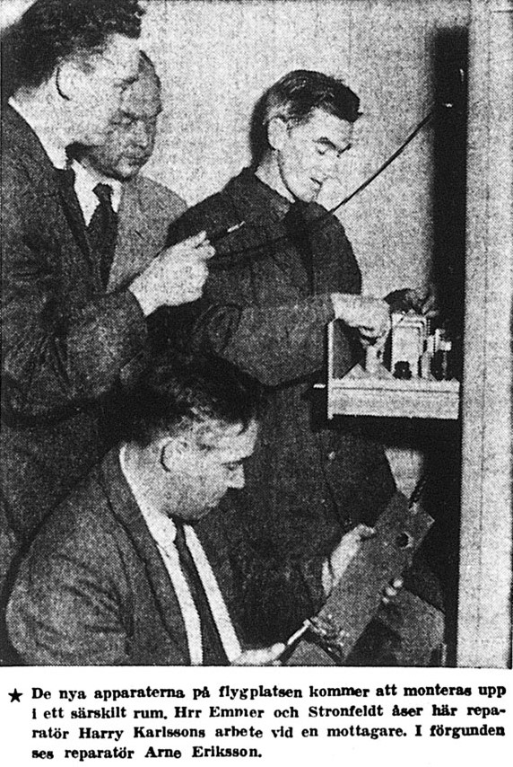 Karl-Arne Markström (f.d. systemingenjör på Televerket Radio): Det är troligt att den radioutrustning som fanns i stativet i bakgrunden på bilden i ÖK är av amerikansk tillverkning, Aerocom eller Wilcox Electric, eftersom sådan användes mycket inom Telegrafverket/Televerket under 50-talet. En kombinerad långvågs/kortvågs/VHF-sändare från Wilcox Electric med modellbeteckningen 99 var ganska vanlig inom Telegrafverket. Sven Emmer i bakgrunden var företrädare till dåvarande "provrumschefen" Ragne Grundberg som jag var arbetskamrat med inom Östra Radioområdet i början av 80-talet, och dessutom morfar till en nuvarande yngre kollega. Harry Karlsson har jag för mig arbetade inom luftfartsradion på Bromma långt innan min tid. |