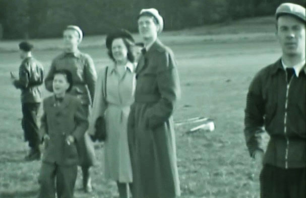 SG-38 SE-59 fick sin registrering 1943-07-07 och Grunau Baby SE-SBS registrerades 1942-09-22. De var klubbens enda flygbara plan när filmen togs. Klubbens första Grunau Baby SE-SAR hade havererat 1942 och blev flygfärdigt igen först 1947. Startmetoden vid denna tid var vinschning, dvs en ombyggd bil som stod parkerad i bortre ändan av flygfältet och vinschade planet mot sig. Förberedelser för att utvidga det från början lilla flygfältet var säkert i full gång, men filmen visar att det ännu bara var den gamla delen som användes. Därför startade man mot staden i norr och inte längs med skogslinjen åt öster eller väster. Filmrutan med planen ovan är tagen mot öster med Sörbyskogen och Reträtten till höger. Åke Höjertz: Pojken i bilden ovan är min åtta år yngre bror Göran, intill honom min syster Gunnel och jag är den bredvid i teknistmössa. |