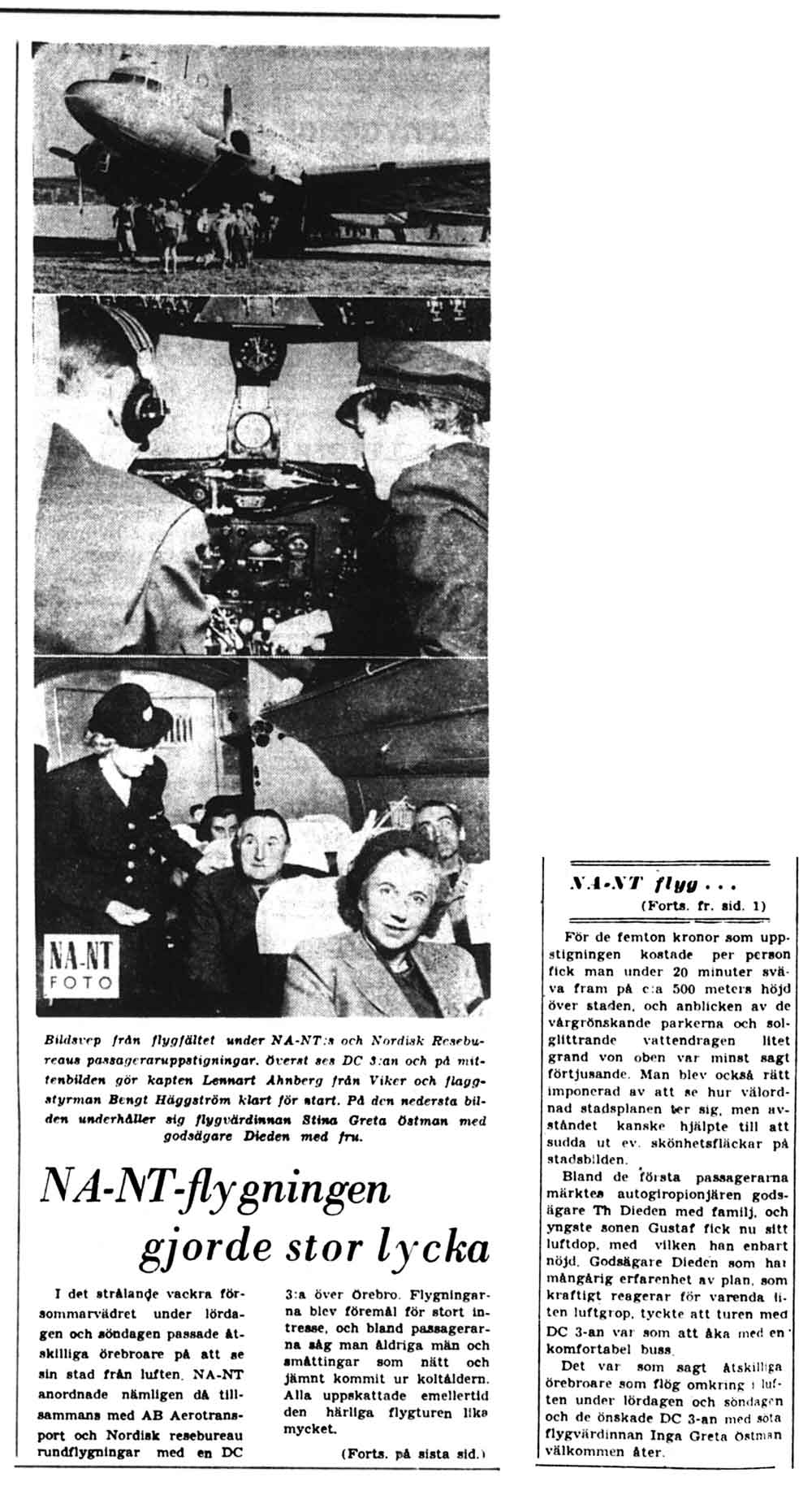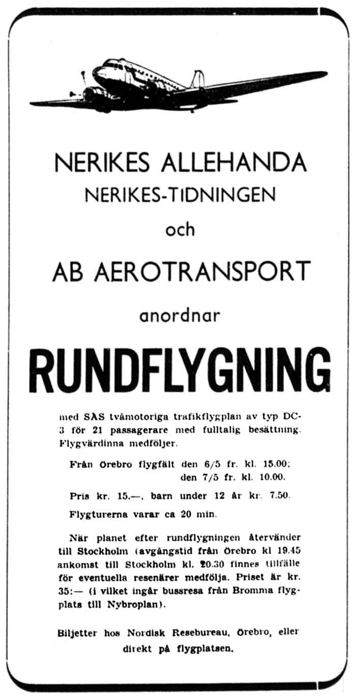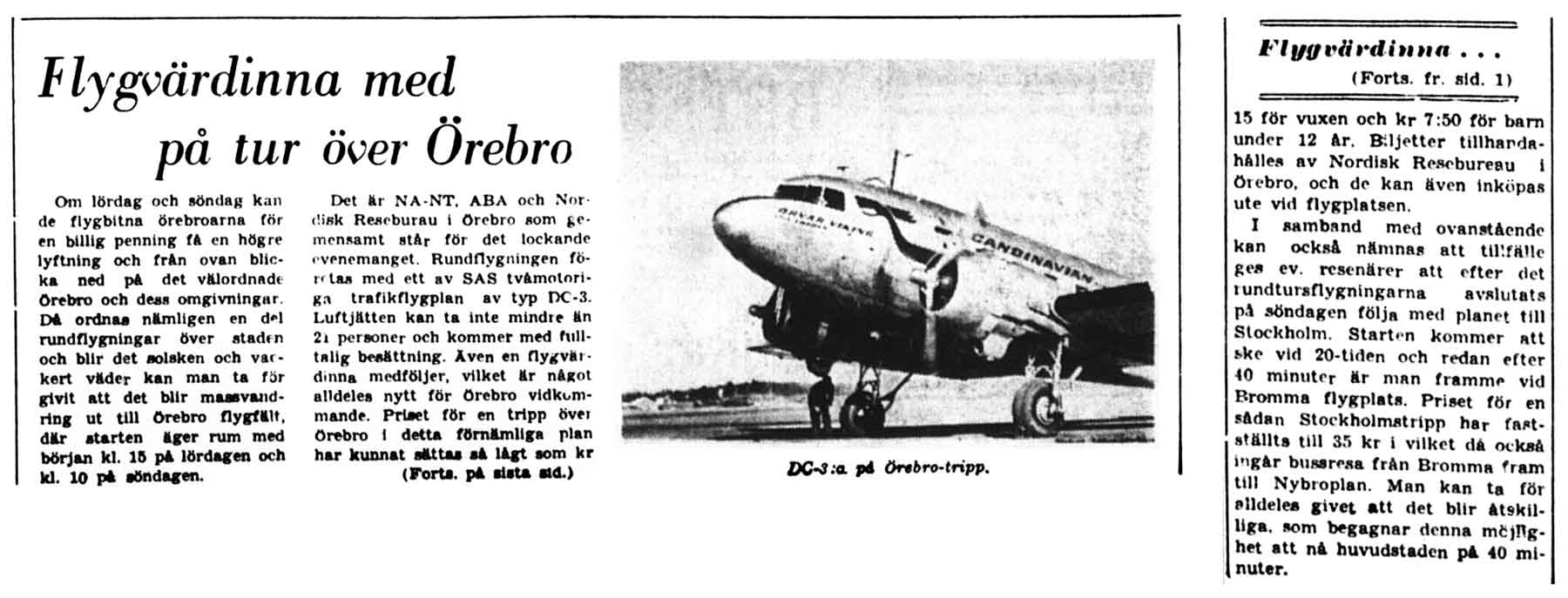 Rundflyg i DC-3 med flygvärdinna   [ sid 1, 12 ]Turer görs på lördag och söndag från Gustavsvik. Nerikes Allehanda, ABA och Nordisk Reseburau arrangerar. För 35 kr kan man efteråt följa med när planet återvänder till Bromma. |
