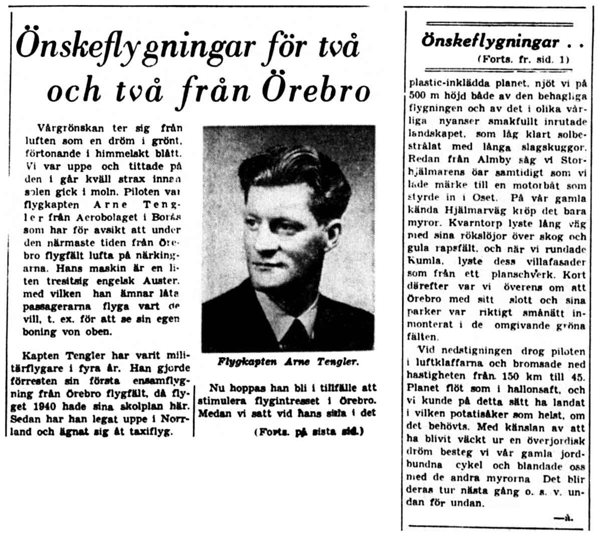 Tengler rundflyger i Örebro   [ sid 1, 16 ]Arne Tengler besöker Örebro med Aerobolagets Auster för att göra rundflygningar här en tid framöver. Vi får också några ord om hans flygarbakgrund, som faktiskt började i Örebro. |