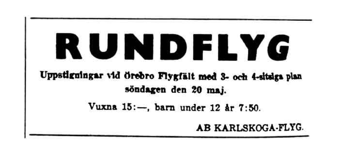 Annons för Tenglers rundflyg   [ sid 2 ]Passagerarflygningar från örebro flygplats i morgon söndag. |