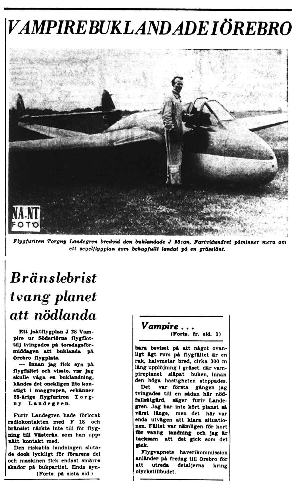 En Vampire buklandar på fältet   [ sid 1, 16 ]Planet fick bränslebrist, men nödlandningen gick utmärkt. |