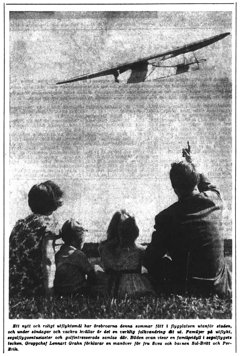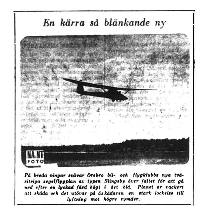 Segelflyg över Örebro   [ sid 1, 13 ]Reportern fick följa med Karl-Gunnar Carlsson i klubbens Slingsby. Efter en hisnande vinschstart flög de in över stan som blev en miniatyr under deras fötter. |