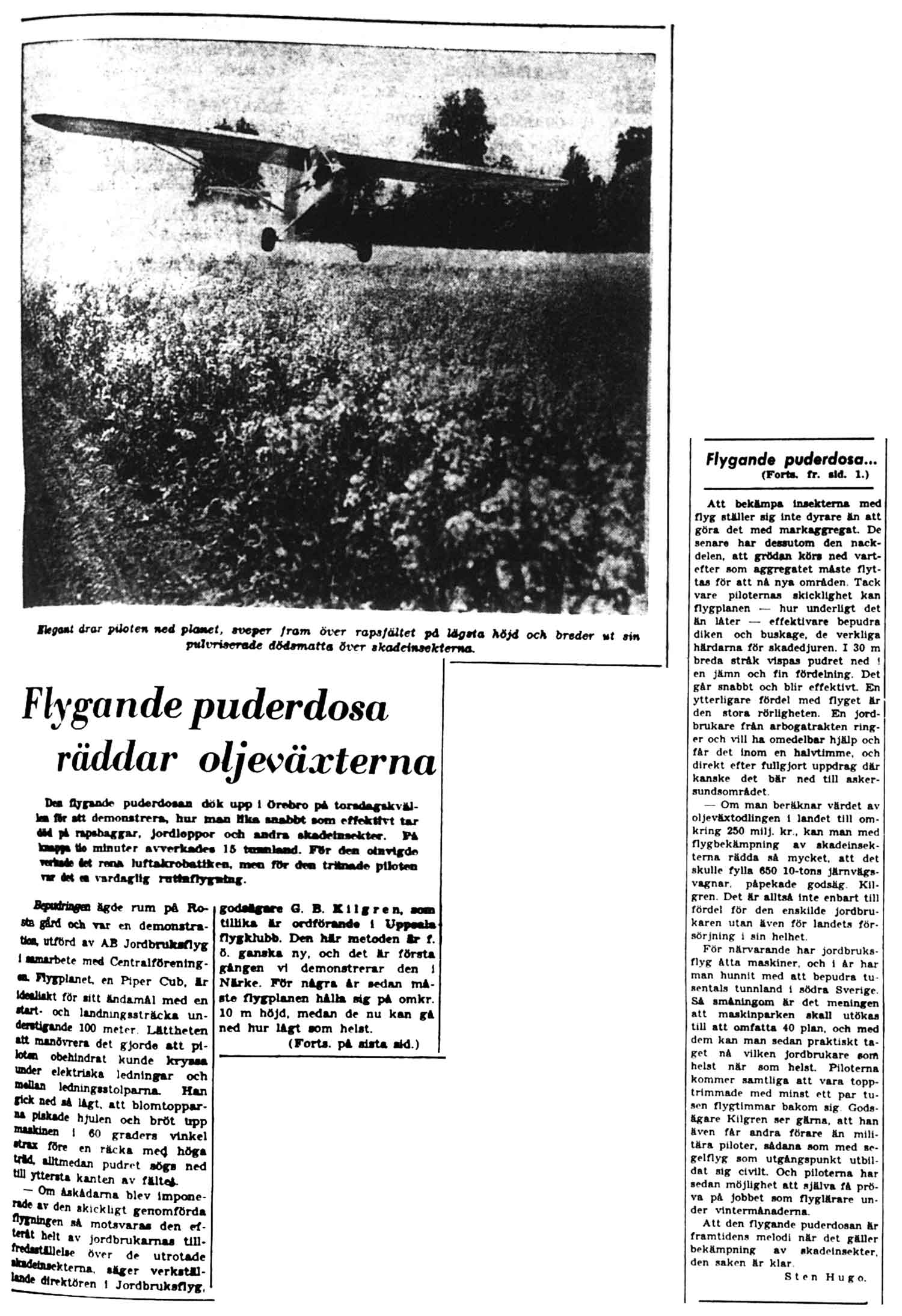 Jordbruksflyg får bas i Örebro nästa år   [ sid 1, 16 ]Jordbruksflygs pilot Bertil Asklöf har haft fullt upp med bepudring i Närke sedan de demonstrerade tekniken för snart ett år sedan. Det är först i år som vi kör i full skala över hela landet, berättar flygchefen Stig Holmgren. Efterfrågan är så stor, att våra nio pudermaskiner borde vara fördubblade till antalet. Den erfarne trafikflygaren Olle Tidblom tränar just nu in sig som puderflygare. |