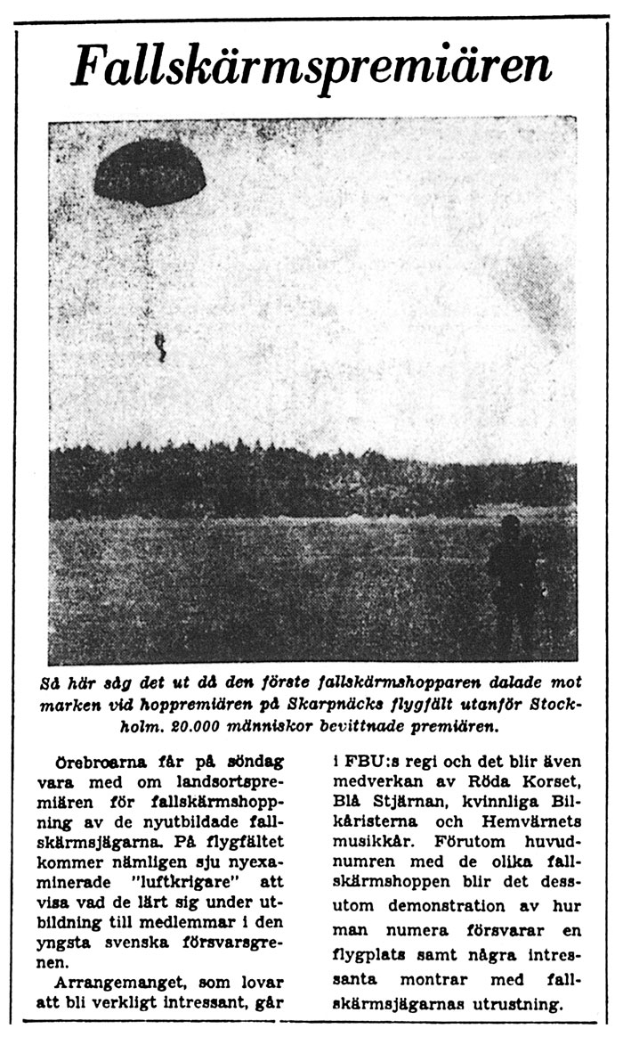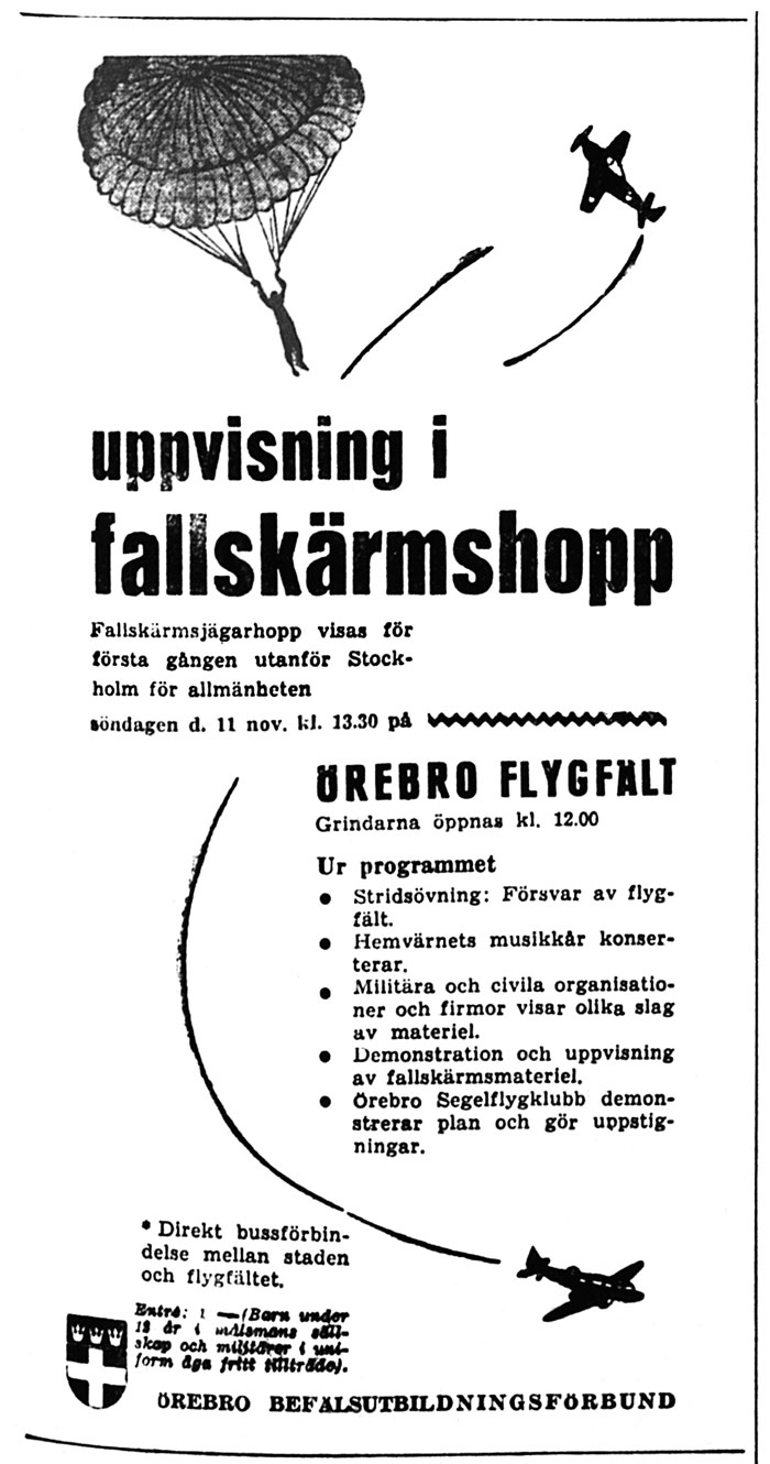Annons: Uppvisning i fallskärmshopp   [ sid 3 ]Fallskärmsjägare visar hopp över Gustavsvik på söndag. Det är deras första visning för allmänheten utanför Stockholm. Flygklubben demonstrerar också segelflyg. |