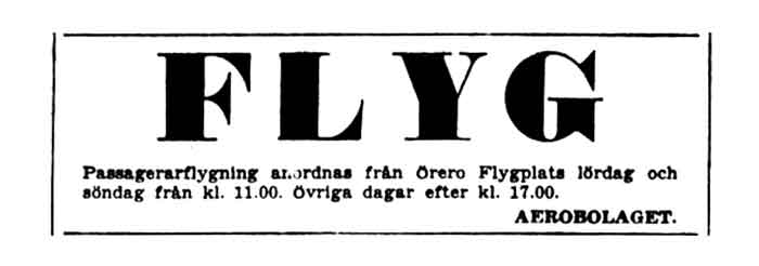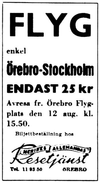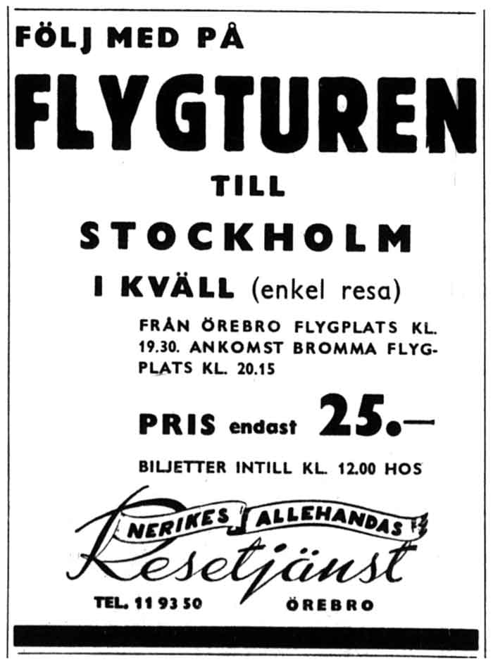 Annons flyg till Stockholm   [ sid 2 ]Nerikes Allehandas resetjänst erbjuder en enkel flygtur till Stockholm för 25 kr. |