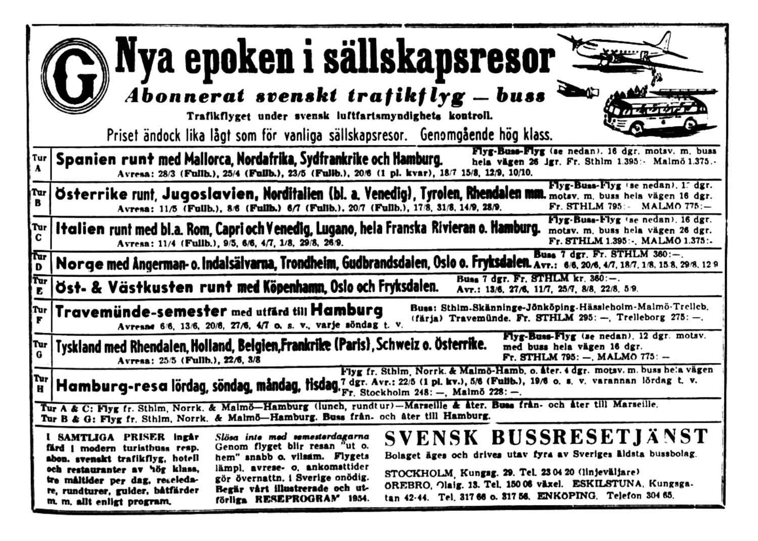 Annons för begynnande charterflyg   [ sid 3 ]En annons för de allra första charterflygresor som "Busskungen" Knut-Oskar Gustavsson i Örebro och Göte Rosén drog igång och som skulle bli starten för turistcharterflyget. Urpremiären var tur A den 28 mars. Göte Rosén: Vi flög med DC-3 som tog 30 passagerare. De fick äta med Bernadotte-designade bestick och dricka i kristallglas, vinglas och nubbeglas, serverade av söta flygvärdinnor. Knut-Oskar sa att bara det bästa var gott nog. Resan var ändå så billig så att det var helt vanliga medelklassvenskar som flög med oss. (Sammandrag av vad en åldrad Göte Rosén berättade för Olle Häger i "Jag minns" på Kunskapskanalen.) |