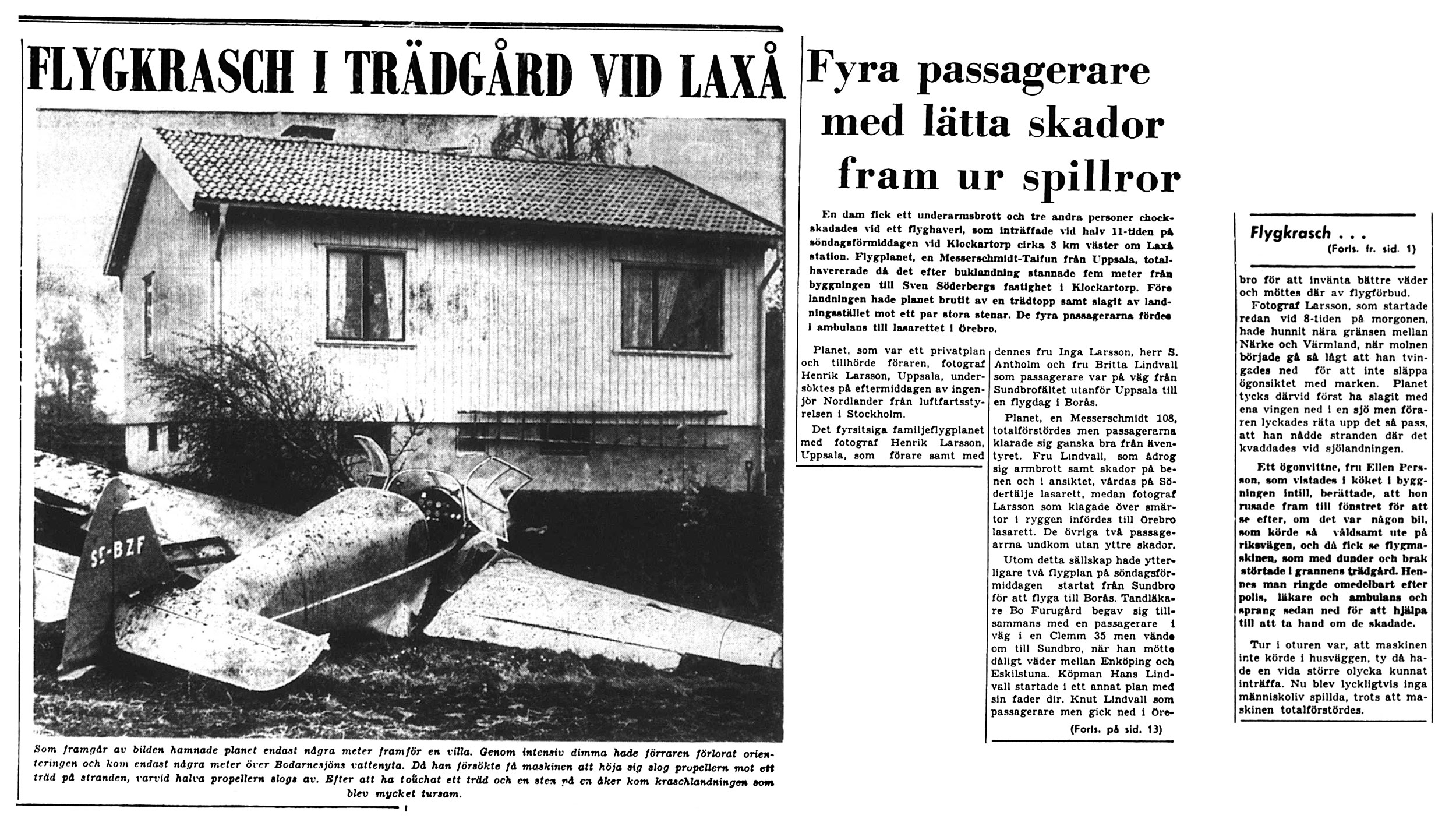 SE-BZF havererar i trädgård vid Laxå   [ sid 1, 13 ]Genom intensiv dimma och en trädtopp kraschlandade Henrik Larsson från Uppsala sin Me 108 Taifun fem meter framför en villa i Klockaretorp, ca 3 km väster om Laxå station. Alla fyra i planet klarade sig ganska bra, men planet totalförstördes. De var på väg från Sundbro till en flyguppvisning i Borås. |
