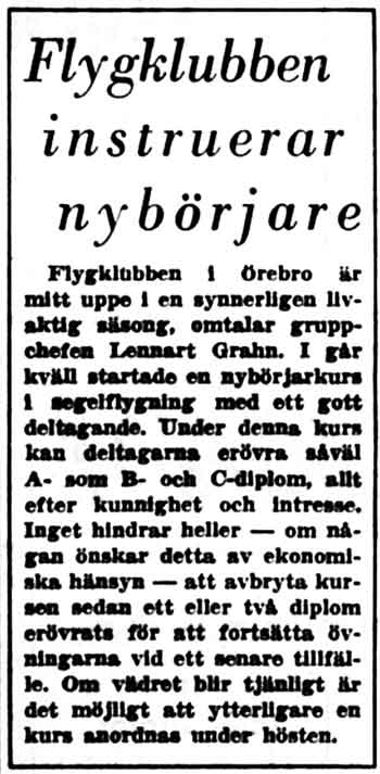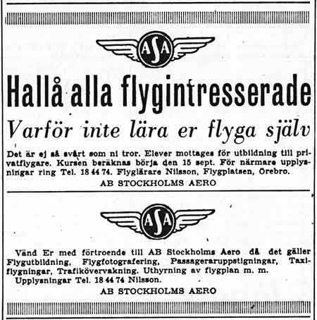 ASA-Flyg annonserar flygskola i Örebro   [ sid 2 ]"Varför inte lära er flyga själv" är deras fråga i annonsen. Kursen beräknas börja 15 september. |