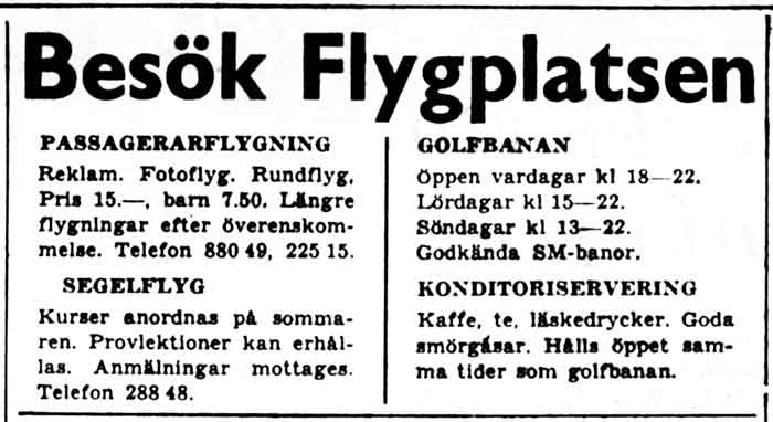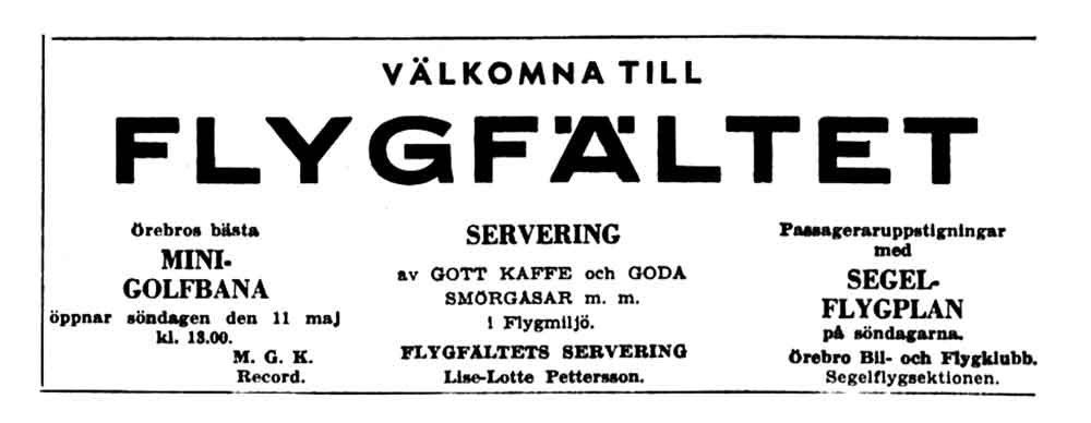 Flygklubben, minigolfklubben, serveringen och Arne Tenglers Firma Flyg-Trafik har gått samman om en annons för att locka örebroarna till flygfältet. 880 49 var Arnes hemtelefon.