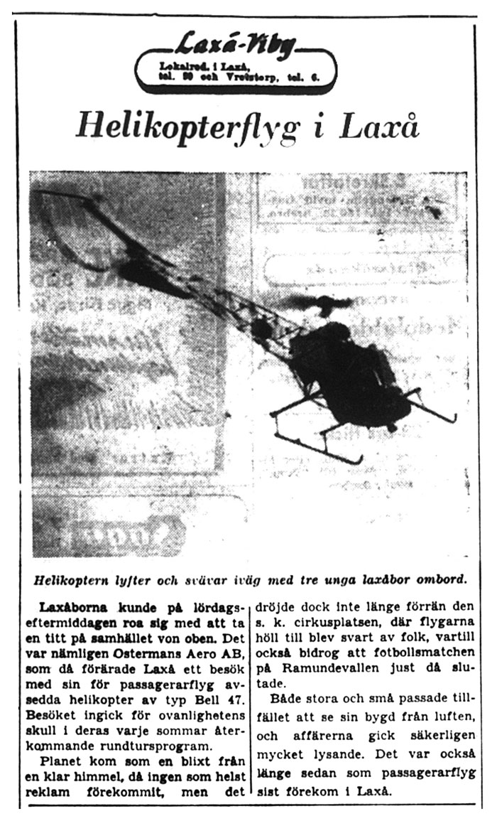 Helikopterflyg i Laxå   [ sid 11 ]Ostermans Aero gjorde passagerarflygningar över Laxå med en Bell 47 i lördags. De gör runflygsturneer varje sommar, men denna gång inkluderade de även Laxå. Trots all avsaknad av reklam var Laxå cirkusplats snart svart av folk, och många kostade på sig en flygtur. |