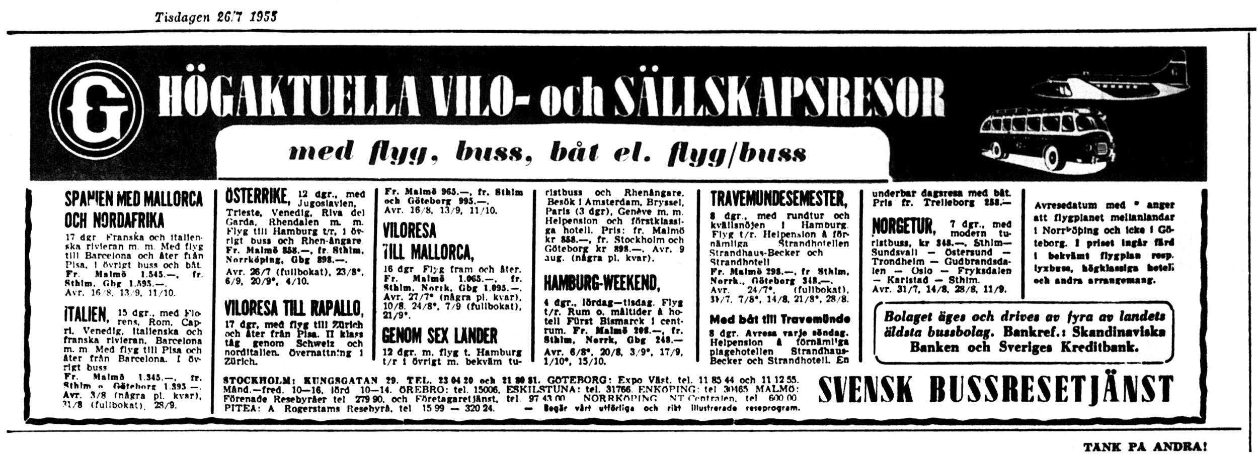 Annons för Bussresetjänsts charterflyg   [ sid 3 ]Under Knut-Oskar Gustavssons G-logga annonseras semesterresor, varav nästan alla med flyg. Planen går till till Barcelona, Pisa, Hamburg, Zürich och Mallorca. Det svenska charterflyget har lämnat barnstadiet. |