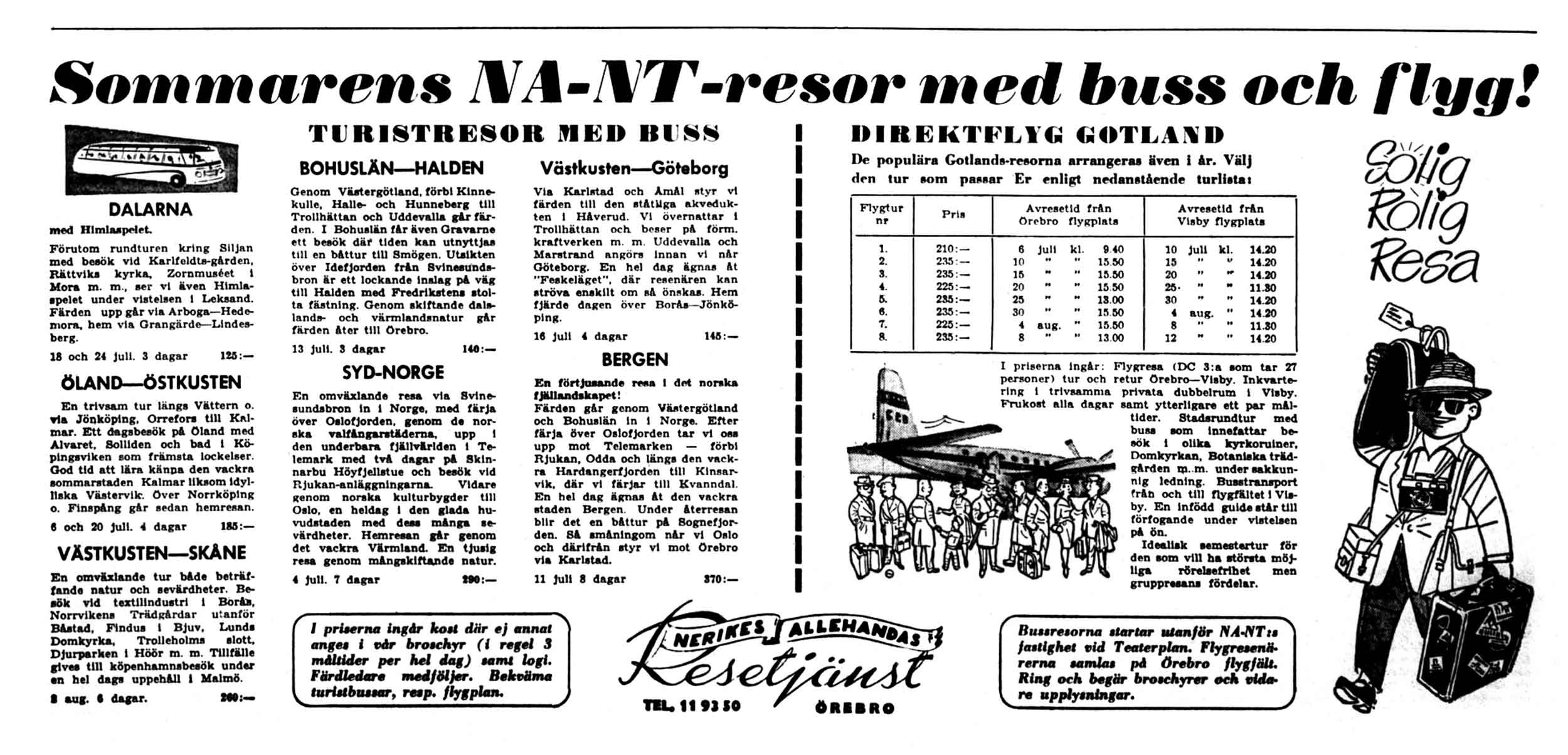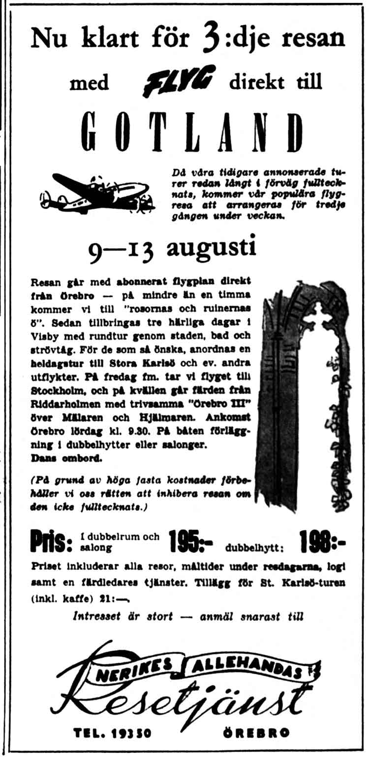 Annons för NA-NT:s flygresor till Gotland   [ sid 11 ]Nerikes Allehandas restjänst har stor annons för turistresor med buss till olika svenska och norska destioinationer, samt "de populära gotlandsresorna" med flyg från tidigare år. Den 9 juni fanns ännu en annons för just flygresorna med orden "Ni reser snabbt och bekvämt med Linjeflygs DC 3-or". |
