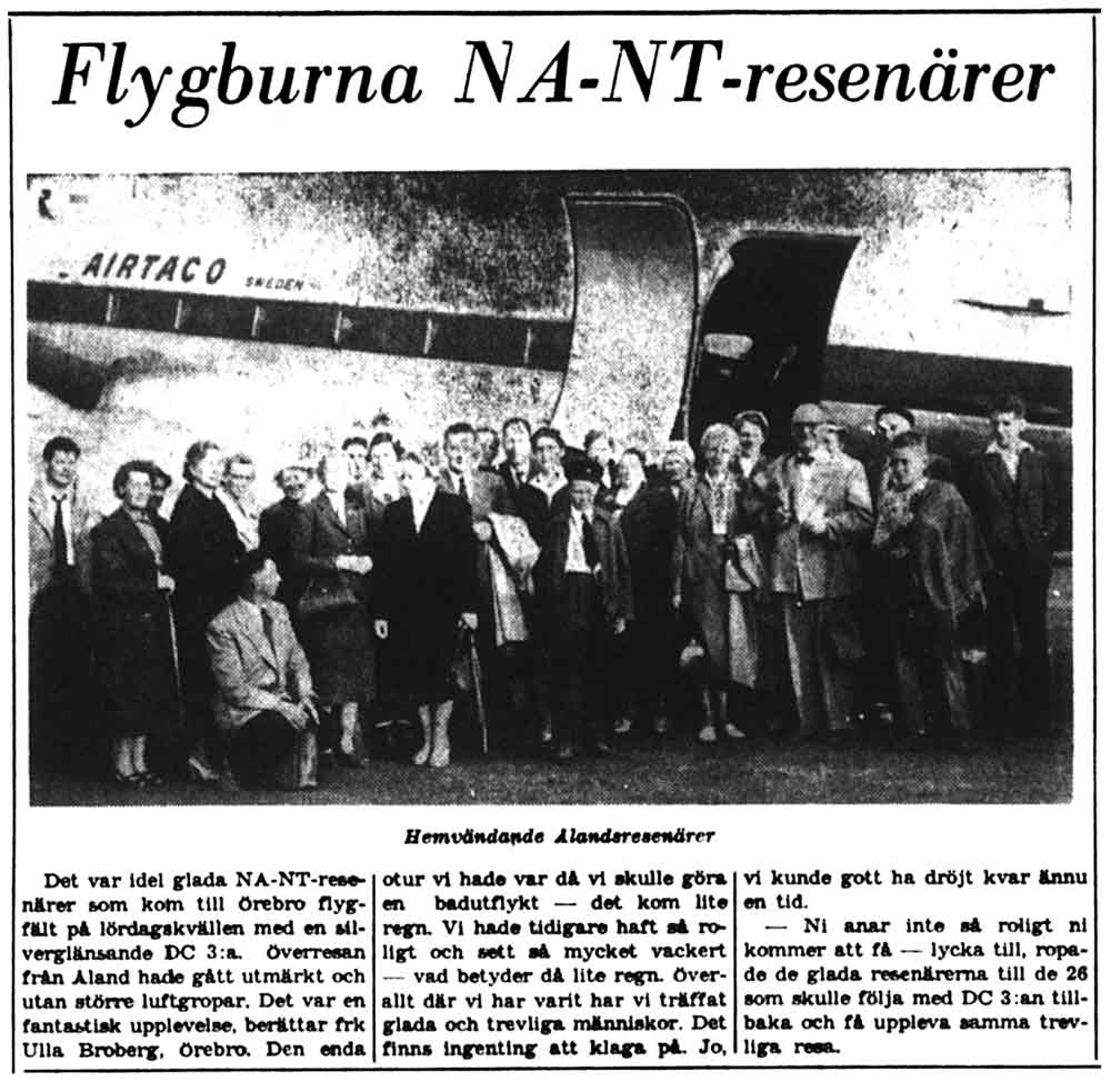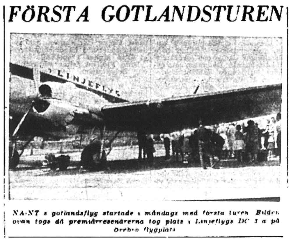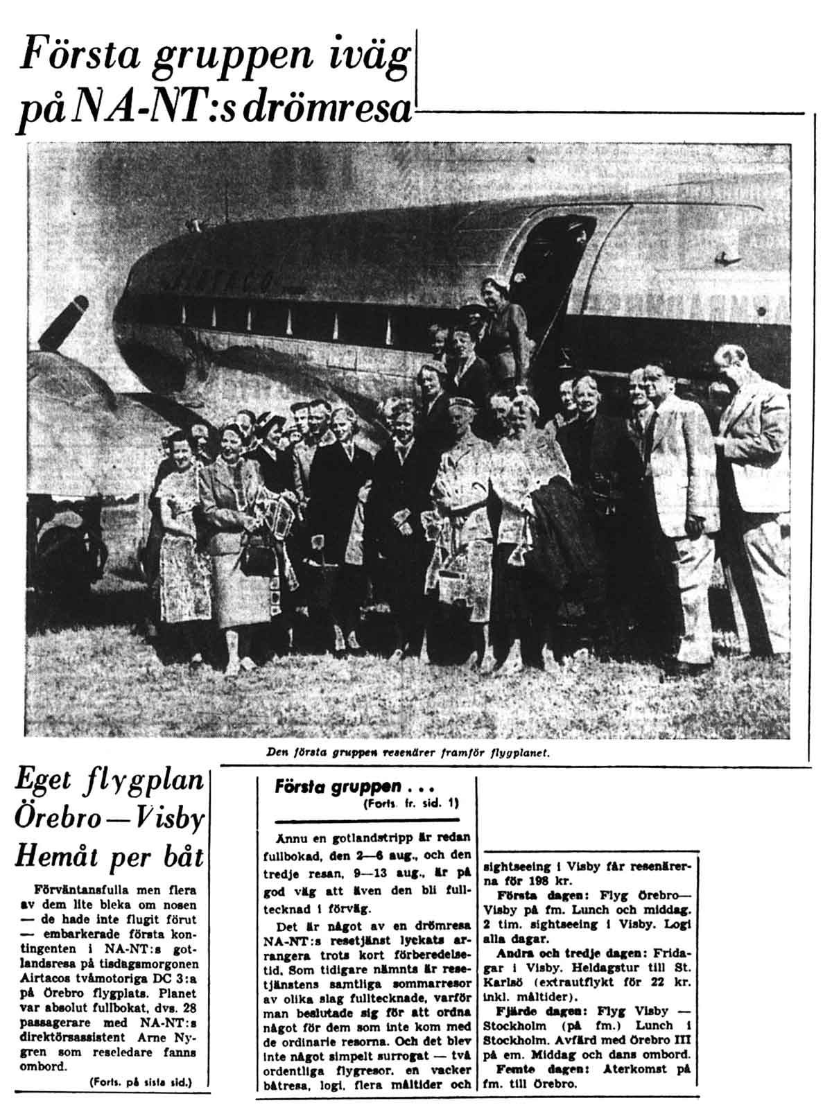 Nerikes Allehandas första flygresa till Gotland   [ sid 1, 12 ]Nerikes Allehanda är charterpionjären Knut-Oskar Gustavsson hack i häl med att arrangera flygresor, fast de har ett mindre avlägset resmål. I gengäld behöver man inte ta sig till någon storflygplats, utan embarkerar Airtacos DC-3:a på hemtama Gustavsvik. |