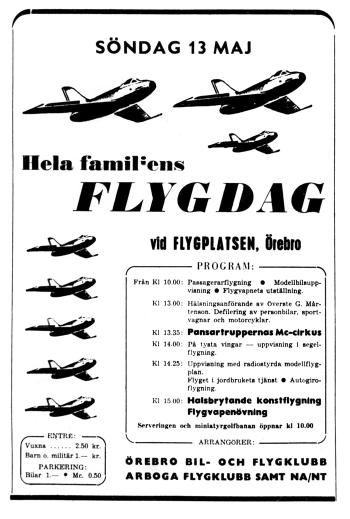 Annons för flygdag sön 13 maj   [ sid 5 ]Passagerarflygning, modelluppvisning, Flygvapnets utställning, överste G Mårtensson hälsar välkomna, defilering av personbilar, sportvagnar och mc, Pansartruppernas mc-cirkus, segelflyguppvisning, radiostyrda modellplan, jordbruksflyg, autogiro och Flygvapnet. |