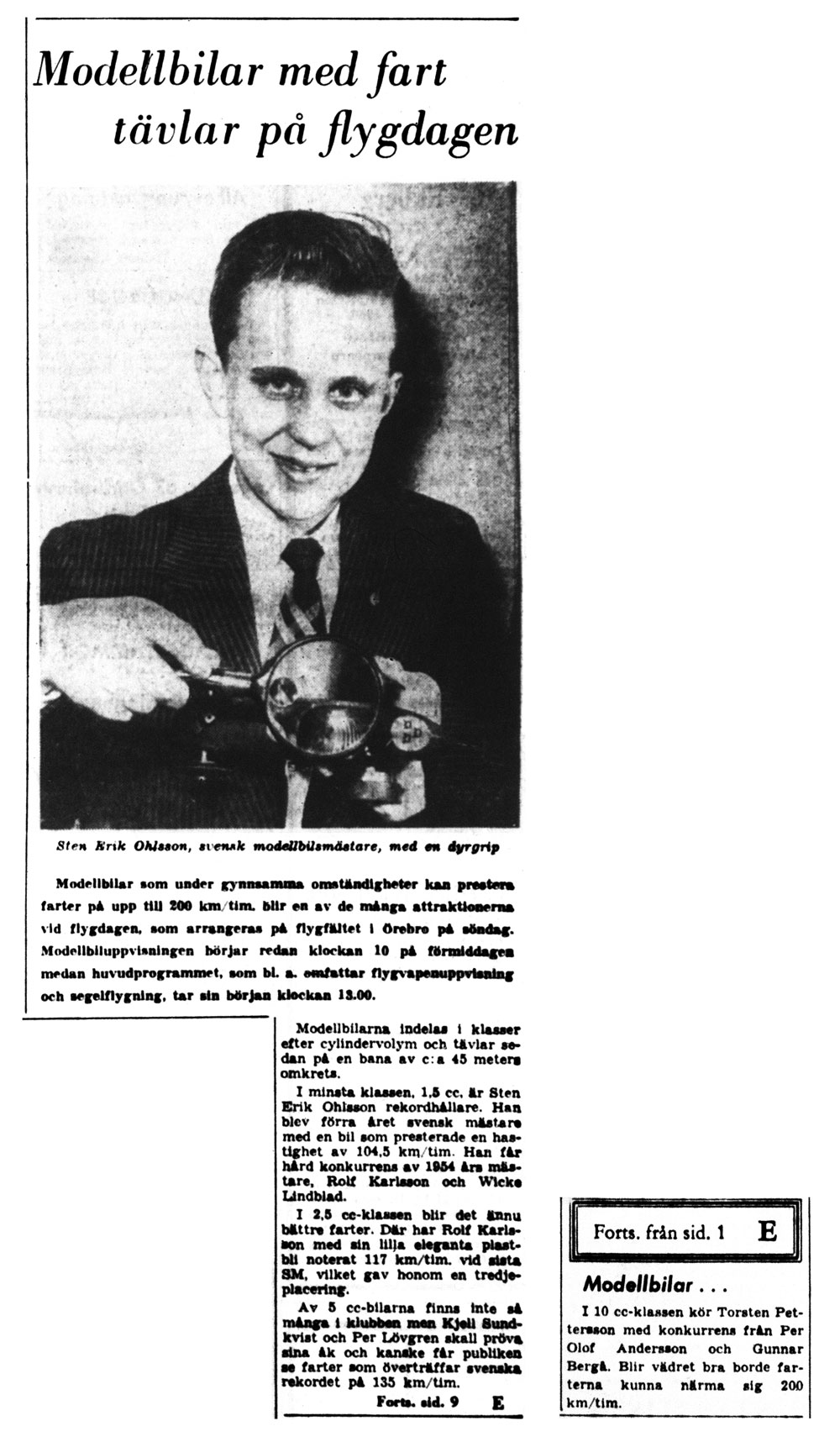 Modellbilar tävlar på flygdagen   [ sid 1, 9 ]Modellbilar med farter uppemot 200 km/tim ska visas. Flera namn nämns, bl.a. Gunnar Bergå. |