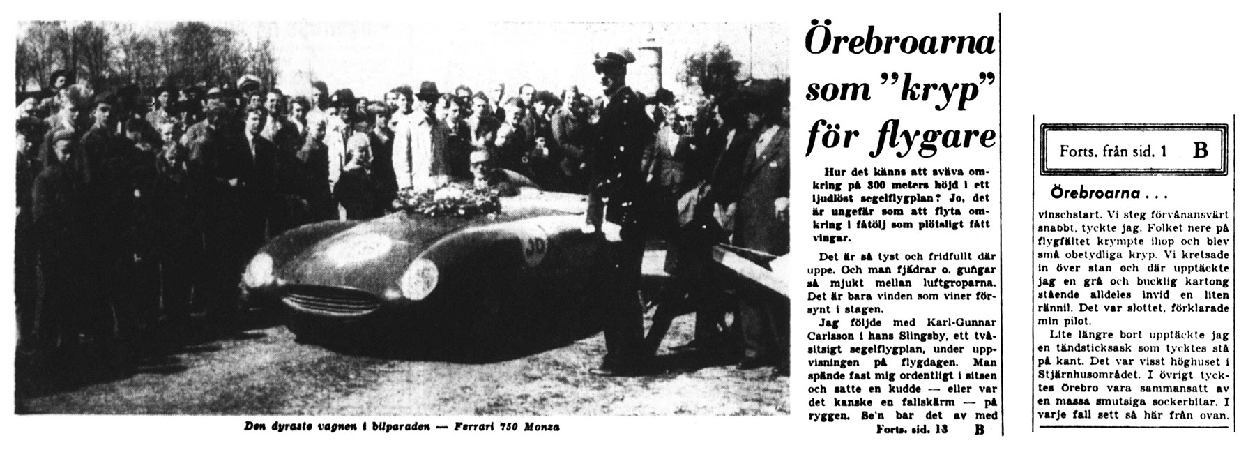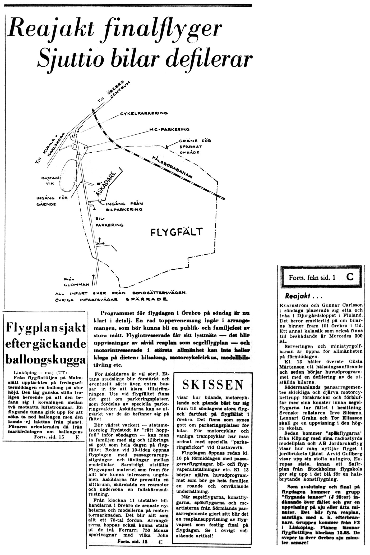 Tiotusen såg flygdagen   [ sid 1, 13 ]Den första flygdagen i Örebro på många år blev en solig och färgsprakande familjefest. Ingenjör Bergå och hans skyddslingar släppte iväg sina fartvidunder till modellbilar. Över 200 rundflög före huvudprogrammet, och ytterligar runt 300 efteråt. Programpunkterna avlöste varandra, bl.a. gjorde segelflygarna Silesmo, Grahn och Eliasson en elegant uppvisning och samtidig landning. |