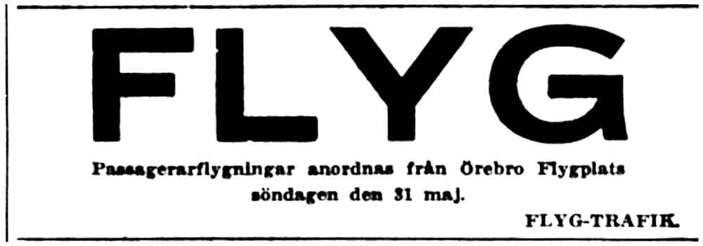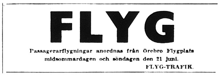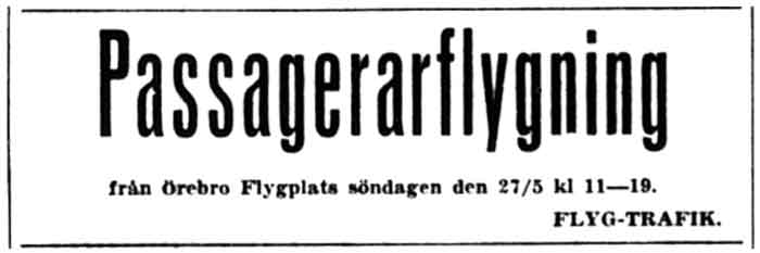 Annons för Tenglers rundflyg   [ sid 2 ]Passagerarflygningar från örebro flygplats i morgon midsommar och i övermorgon söndag. |