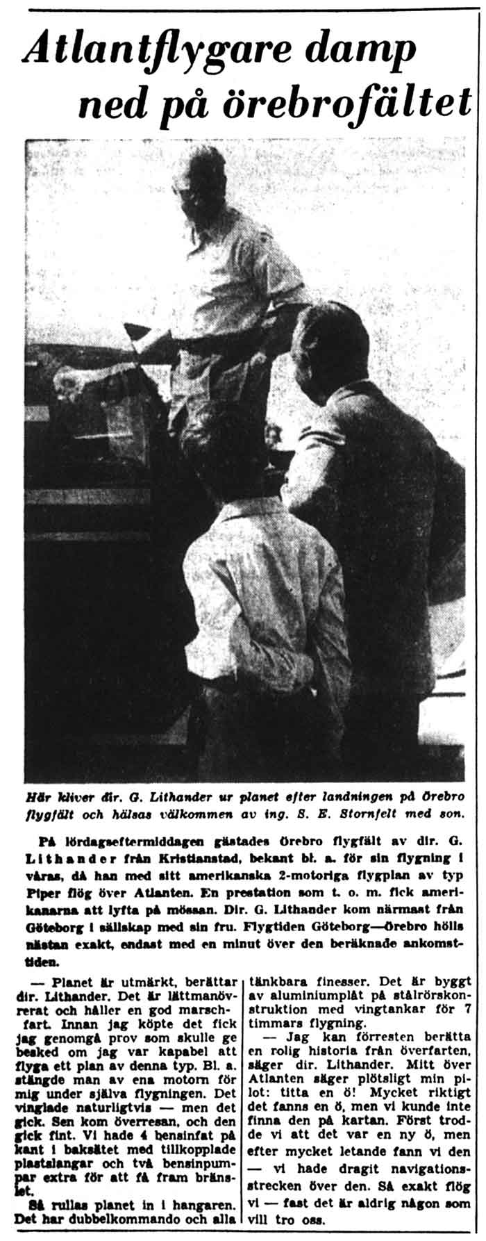 Georg Lithander landar i Örebro   [ sid 14 ]Lithander berättar om sitt plan, med vilket han nyligen flugit över Atlanten. Det måste vara Piper Apache SE-CBL som han enligt SFF:s civilregister flög från New York 3 juni via Island till Torslanda tillsammans med U Engelbrecht. |