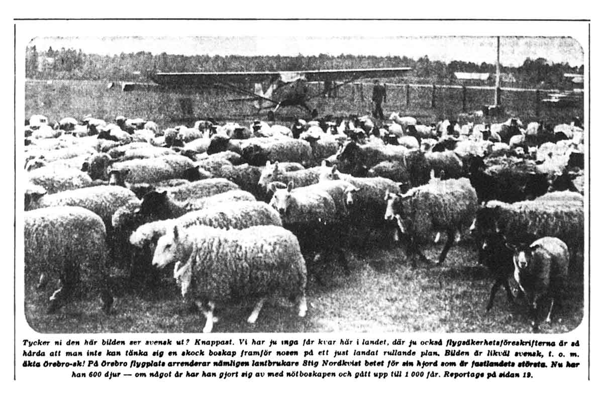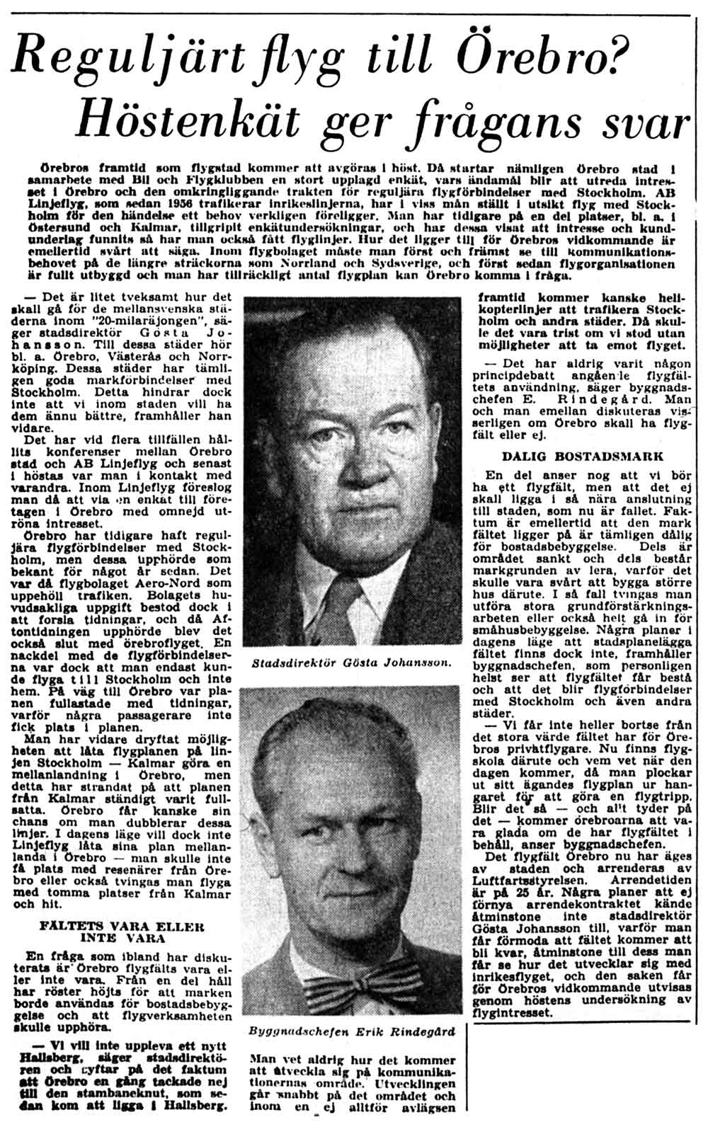 Ska Gustavsvik nedklassas?   [ sid 1, 4 ]Gustavsvik löper risken att nedklassas av Luftfartsstyrelsen till enbart sportflygfält. Flygplatschef S E Stornfelt trivs egentligen bra på örebrofältet, men har med tanke på sin egen framtid accepterat en tjänst på en flygplats med större utvecklingsmöjligheter. |
