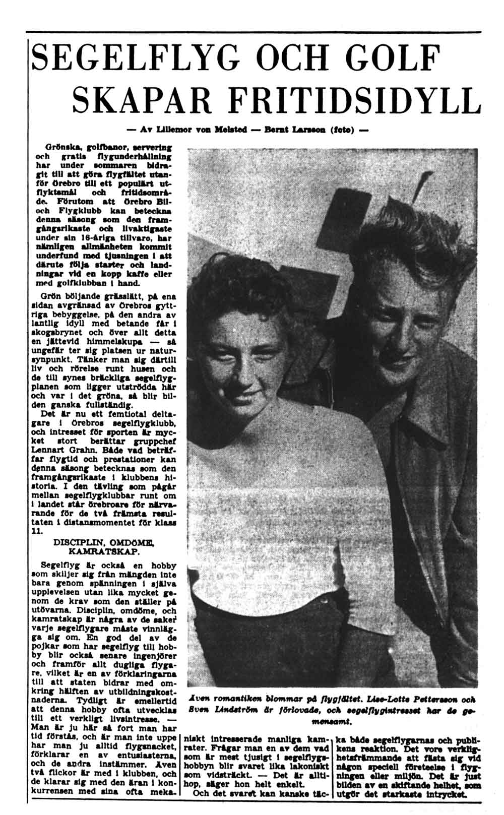 Med segelflyg över Örebro   [ sid 1 | sid 4 ]Reportern beskriver lyriskt sin segelflygtur med Irve Silesmo i en Kranich och det lilla Örebro han ser under sig. Men flygbilderna är nog inte tagna från segelplanet, utan snarare vid en separat fototur med Arne Tengler i hans Stinson med avtagen högerdörr. |