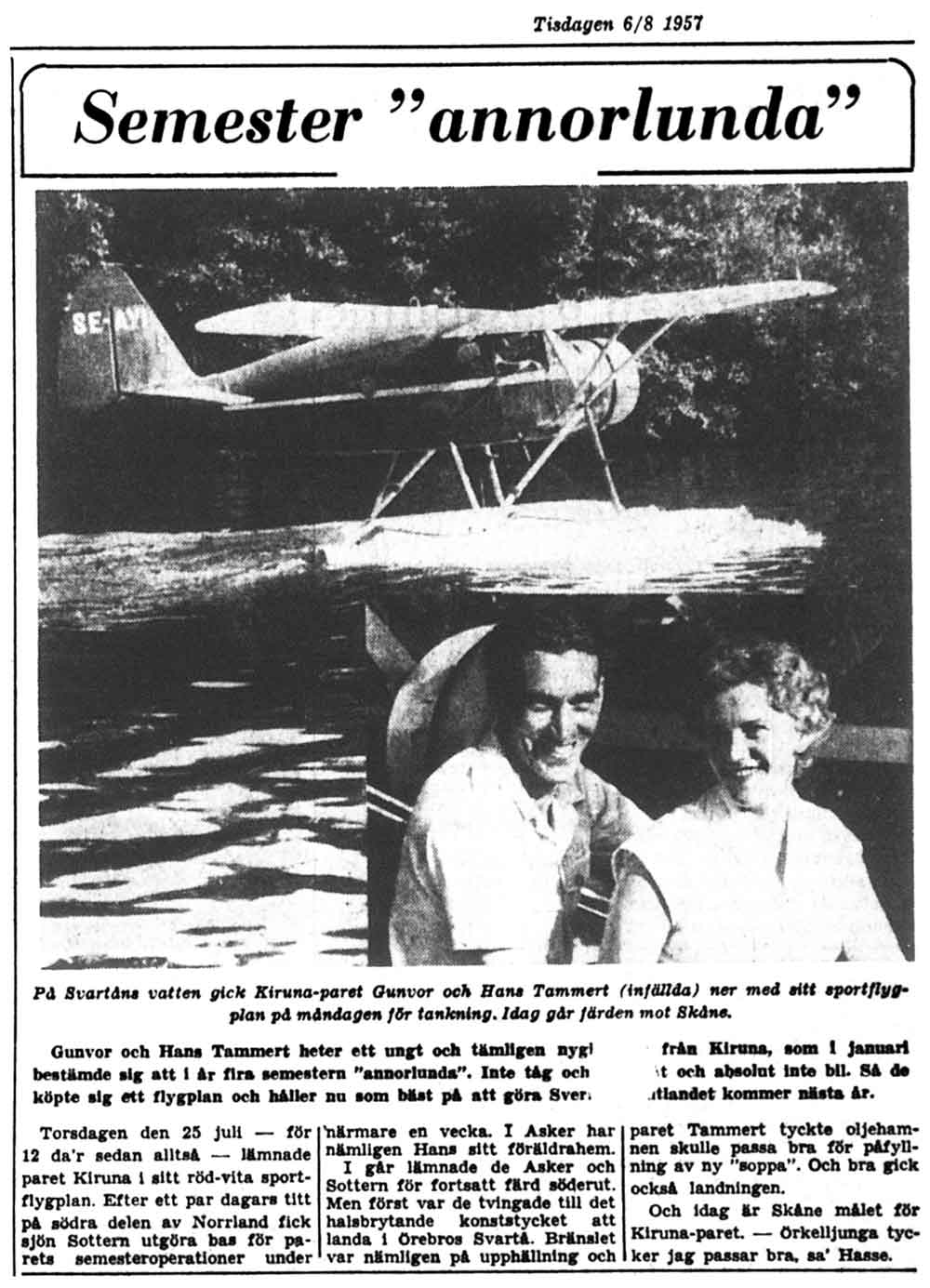 Kiruna-paret Tammert landar på Svartån   [ sid 8 ]Hans Tammert gjorde en halsbrytande landning på Svartån för att kunna tanka sitt sjöflygplan (en Fairchild Forwarder SE-AYI) i oljehamnen strax nedströms Örebro. |