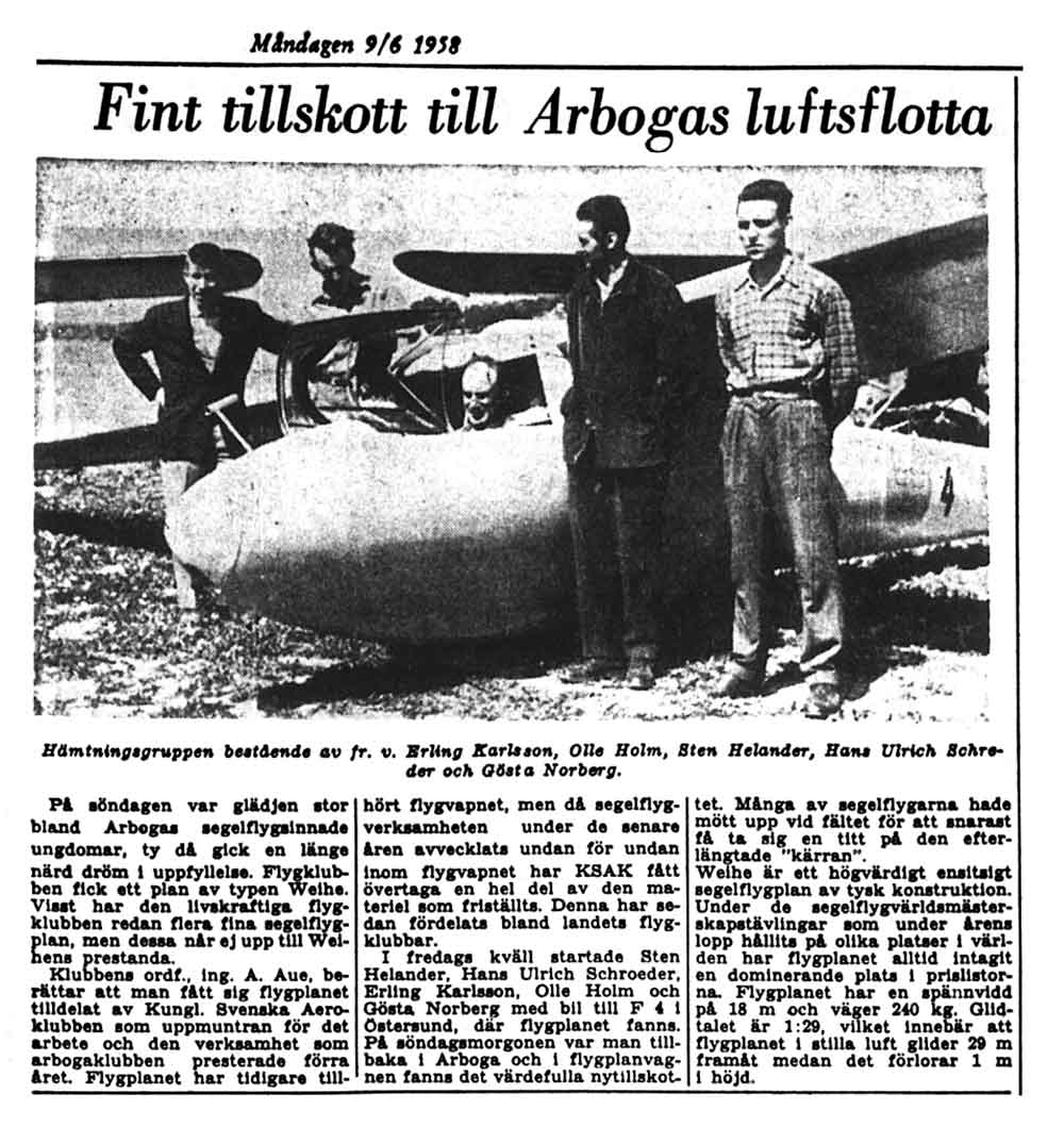 Arboga får en Weihe   [ sid 13 ]Gruppen som for till F 4 i Östersund för att hämta Weihen bestod av Erling Karlsson, Olle Holm, Sten Helander, Hans Ulrich Schroeder och Gösta Norberg. Rolf Broberg: Hans Ulrich Schroeder som var med i hämtningsgruppen, skulle ungefär 1964 bosätta sig i Örebro och bli klubbens flygmekaniker. Jag tror att han då även for runt och mekade i Arboga, Köping och Eskilstuna. |