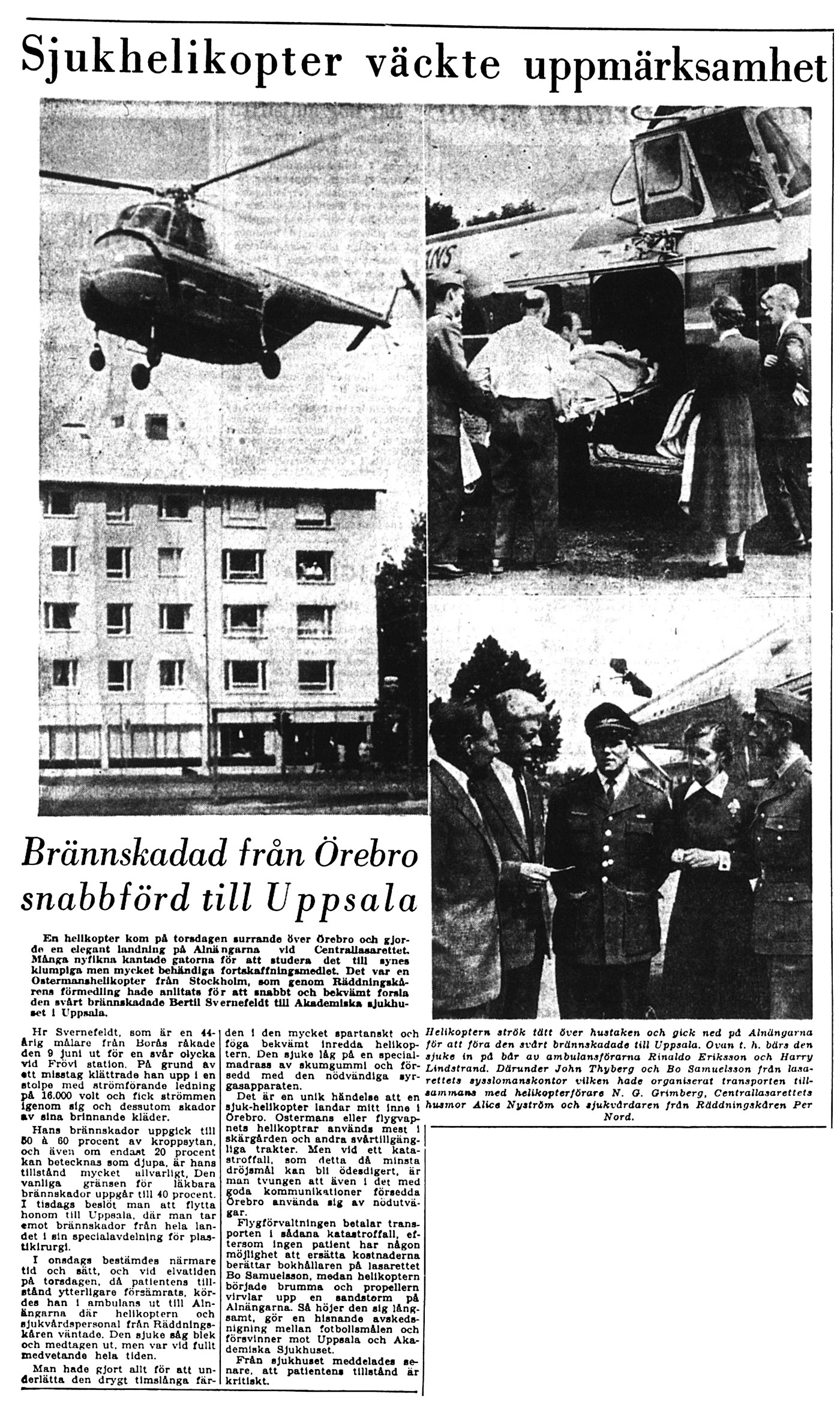 Helikopter tog brännskadad från lasarettet till Uppsala   [ sid 10 ]Ostermans helikopter förd av N G Grimberg strök tätt över hustaken i Örebro och landade vid centrallasarettet. Där hämtades en svårt brännskadad patient för att föras till Akademiska sjukhuset i Uppsala. Rolf Broberg: Bilderna visar att helikoptern är en Sikorsky S-55. Det måste vara Ostermans SE-HBA som flög 1954 - 6 sep 1963. De hade även systermaskinen SE-HBB 1955 - 19 feb 1958, men den fanns alltså inte kvar i jun 1958. Se vidare Nordic Rotors om SE-HBA med länk vidare till SE-HBB. |